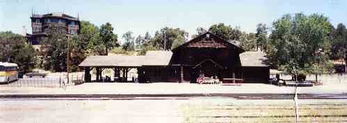 Stopping for water breaks and lunch, we realized places keep changing, shifting, all day, every few minutes. As the sun moves across the sky, it reflects not only off a spot, but off a hundred other spots that themselves affect the light on that first spot. So every 15 minutes, the colors, shadows and whole appearance of each spot totally changes. The Canyon is thus like a disco ball. You can set up a camera aimed at a particular scene and shoot a whole roll of film, a new picture every 15 minutes all day, and no two pictures will be alike. Pinks, purples, reds, yellows and blues keep interacting with each other. Far below us, we could see the South Kaibab Trail, just a dusty brown line, as shown at left. Eventually, we found other trails, some descending to the river, some, like the Tonto Trail, running along the plateaus. The trails appeared to be empty. Then we used our binoculars and could see they were teeming with people backpacking and others riding the donkey trains. The trails are so far down you can't make out the people or donkeys with the naked eye. We had the same experience with the Colorado River. At first, all we could see was a tiny brownish green line, way out there, squiqqling westward. Then, with our binoculars we could see how big and powerful the river is, and could make out the rafts loaded with people descending the canyon on one of the commercial trips. The Colorado is moving so fast it's dangerous to hikers and campers, who could be swept away trying to wash dishes or cool off their feet. The rapids and waterfalls are so big the rafts have to be large to carry passengers safely without being swamped. Yet even with that fast flowing river and those big rafts, a trip through the canyon takes a full week. On your day or so of orientation on the South Rim, be sure to take advantage of the great restaurants and gift shops. You do have to make reservations by about noon to guarantee seating for dinner, but it is definitely worth it. Drop in on the old lodges, especially El Tovar, even if you're not staying there. They're century old examples of that National Park Rustic architecture and are national treasures. There are bus tours and ranger presentations. If you come in by van or car, check the schedule and make sure you drop by the railroad station to see either the arrival or departure of the daily passenger train. This is a historic gem in its own right, all original, beautifully maintained, worth several photos. Do not be deceived by the desert climate and Arizona location. Summer nights here can get cold. We've slept in hooded sweatshirts in down bags in June on the South Rim, and the North Rim is even colder. However, down in the Canyon nights are much warmer. |
