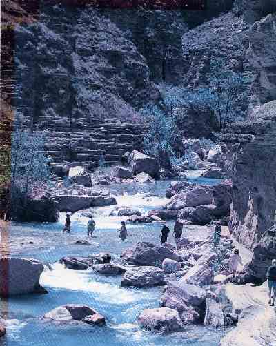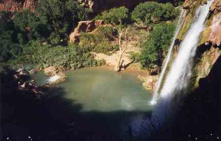 Eventually, take the South Bass Trail up to the rim, where it becomes the Esplanade Route. Follow it to Apache Point. The trail ends here, but you're on top, and it's an easy orienteering cross to Topocoba Hilltop, where the trail begins again, now known as Topocoba Trail. Follow it down to Havasu Springs, where you join the Hualapai Trail and continue downstream to the village of Supai. After checking in at the Visitor Center, you hike another mile below the village to the campground. And you have found the closest place to Shangri-La available in the U.S. The pictures left and below show why. Beautiful waterfalls and pools are bordered by smooth rocks and oak trees. A spacious shady campground along a deep, cool, rippling stream. A spring bubbling out of the side of a cliff. This is Havasu, the Grand Canyon West, a part of the park seen by less than one per cent of all visitors. Making this visit will take a little advance planning, however. For this is Havasu Nation, the Indian Reservation. You need to apply for passports and wear them on your backpacks. You need advance reservations at the campground. |