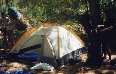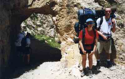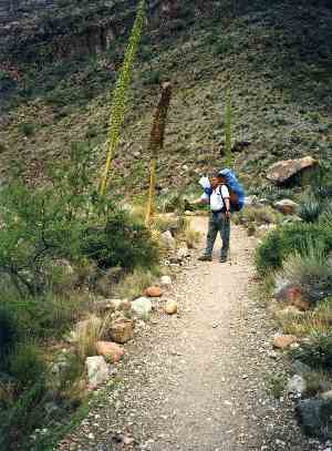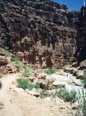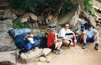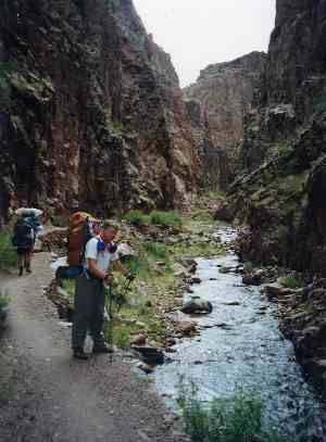 As you notice from the pack covers in the pictures above, we got rained on coming down from Cottonwood Campground to the ranch. It was strange. The water was steaming where it hit the hot rocks. But it was sort of refreshing, and it cooled things off briefly. The Box was a lot more enjoyable without the intense heat. As you relax at the ranch one more night, you have decisions to make. First of all, we recommend turning right across the bridge and heading West. This will send you up the Vishnu Switchback, an awesome climb to the Tonto Plateau. The campsite up there is Indian Gardens, where the Havasupai actually did raise crops. There is a ranger station, composting rest room, water and even a little shade. You then hike out by heading straight up Bright Angel Trail. It's 4.7 miles to the top, with resthouses at the 3.0 and 1.5 mile points. After the rugged semiwilderness you've been through, this is a real luxury. But this is a steep climb, and will take most of a day with a backpack. |