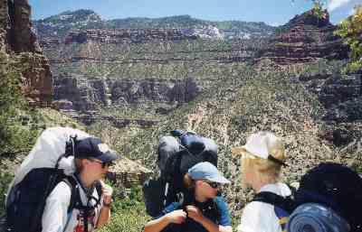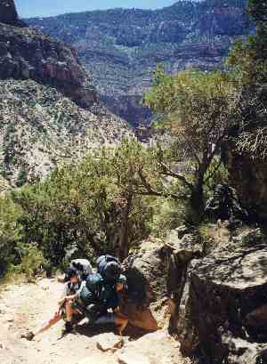 This is a pretty demanding trip, and should absolutely not be the first expedition a youth group or family makes. You need some prior experience in hot weather parks like Bryce, Zion and Big Bend and long backpacking treks like the Wind Rivers and Glacier.You also need time to accumulate the needed equipment and learn how to travel as light as possible and still have what you need. We never carry more than 30 pounds per person into the Canyon. Of course, knowing you can eat meals at Phantom Ranch and North Rim Lodge lightens your load somewhat. You only need to cook at Cottonwood both directions and Indian Gardens on the return trip. This reduces the amount of food and fuel you need. You won't need the cold weather clothing and down bag unless you plan to camp on the North Rim. Use them on the South Rim, then leave them in your van or check them in a pay locker when you hit the trail. Conditioning is another issue. You have to invest some time in conditioning before this trip. In Kentucky, hiking the Gorge, big South Fork and Cumberland Gap can tone your legs and cardiovascular system for the long, steep climbs and descents. If you live elsewhere, find a trail in your state with challenging ups and downs. Or find a college football stadium and, wearing your loaded backpack, hike to the top and back down several times, and do it three times a week for a few months. In the gym, we like a good stepper, a treadmill that can be cranked up to at least a 20% angle, a leg press machine, and an abflexor. Remember to turn around on the treadmill and do at least a mile a day backward, to condition shins, calves and thighs for the long descents. |