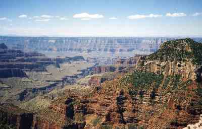 We recommend spending at least one full day on the North Rim, but ideally you could stretch this to two or three. It's worth it. There are more hiking trails on this side of the park, more wildlife, and more variety. The climate is cooler, you're in forest almost all the time, and there are only 10% of the people. This is really the outdoors part of the park. The Canadian Conifer Forest Zone is home to quite a few black bear, wildcat and mule deer, and reclusive mountain lion and wolves. The campground here is beautiful and the lodge magnificent. But if you can splurge twice on your trip, we urge you to rent one of the cabins and eat one dinner in the dining hall. The day hiking here is some of the best in any national park. If you hike over like we did, we recommend the Ken Patrick Trail to Point Imperial and Kolb Natural Bridge, including the Uncle Jim Sideloop which will give you stunning views down that Roaring Fork Gorge you labored up for one whole day. We also recommend the Widforss Trail, from which you can look down on the Phantom Creek drainage coming up from the ranch. |