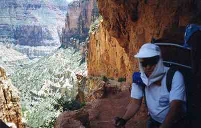 | In some places, the trail narrows until you're hugging the cliff wall, as you can see in the middle background of this photo. Then it widens out again under the rock shelters, again as seen here. The odd looking hat is a French Foreign Legion item which can be soaked in water. Evaporation provides a little cooling effect. In 120 degrees every edge helps. At the location shown, we're almost directly beneath the Grand Canyon Lodge, perched at cliff's edge two thousand feet up. From the oasis to the trailhead we are climbing 3600 feet in 4.7 miles in searing heat and zero humidity. It's hard to believe that in midwinter this trail becomes impassable in deep snow and ice. Thankfully, the last segment of the trail is in forest, as you top out on the North Rim. You're still climbing and switchbacking steadily, but you're doing it on soft loam, in shade, with even the hint of a breeze occasionally. If someone is meeting you with a vehicle, they'll be parked in the lot at the trailhead. Otherwise we suggest turning left at the water tanks and walking to the campground. | ![]() |