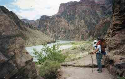 We prefer going down the South Kaibab Trail and making the descent to Phantom Ranch in one day. The descent is long and hot, so be in shape, carry more water than you think you could possibly need, and plan on stopping often. Remember it isn't just downhill. It's very steep downhill on sand and rock. It is more difficult going downhill here than coming up. Your knees and the back of your calves will feel the last two miles. And there are no railings or trees to grab. We highly recommend trekking poles. At the very last minute before leaving the top, soak two bandannas in cold water, do not wring them out, and tie one around your head and one around your neck. Wear a broad brimmed hat and wrap around sunglasses, coat yourself liberally with sunBLOCK, and carry an extra sunblock bottle. This is serious business. They rescue people here every day. You will probably be stopped and checked by a ranger as you begin the hike to see if you're following all this advice. They routinely turn people back who do not have the necessary water, sunblock, hat and glasses. Once past that, they ask about health problems and caution them about various dangers. |