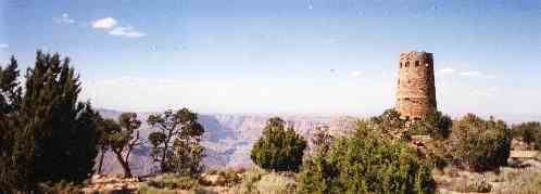 However you get to The Canyon, we recommend coming in at the South Rim and camping for two nights. There are lots of things to see and do here, and since you're not likely to make it back for a while, you want to take advantage of the opportunities while you can. That first full day, you want to hike the South Rim Trail all the way out to Hermit's Rest, spend a while there, then take the shuttle back. Go in the various hotels, browse in the gift shops, and stop at the visitor center. Take the Desert View Shuttle out to The Old Navajo Tower (shown lower right). A Canyon trip requires the most advance planning of any national park trip. You will want to read this material, do your own research, sign up those who are going and collect advance payments, then apply the previous summer for Amtrak, Grand Canyon Railroad, camping, trail, Phantom Ranch, North Rim cabin, mule train, rafting, or any other amenities. All this for early June. If you want a July or August trip, two years advance reservation will be needed. |