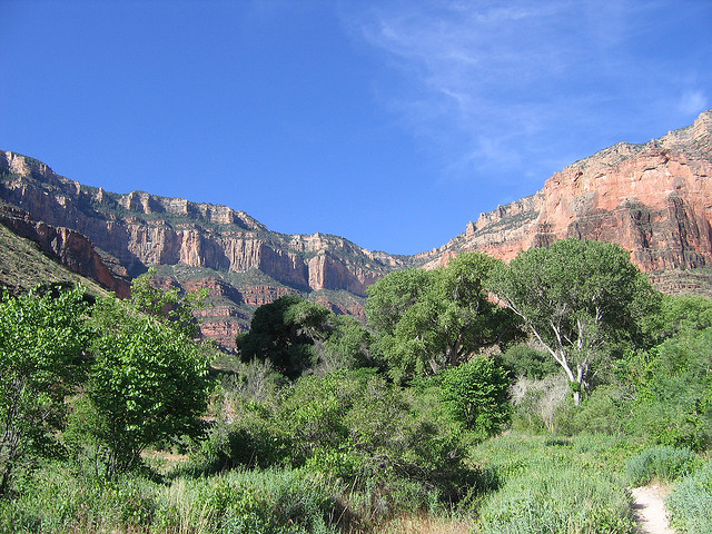 You have two great choices of trails to hike down to Indian Gardens. The first is obviously the Bright Angel Trail, which begins at the Kolb Brothers Studio across the walk and slightly below the rim from the Bright Angel Lodge's western units. It will only take you about two hours to leisurely descend the trail,, stopping often to admire the view or snap photographs. But the one we recommend is the South Kaibab Trail. You hike it down to the Tonto Trail and turn left (west). You can stop for a break at Pipe Springs, then continue along the Tonto Plateau. The photo at left shows the Tonto Trail approaching Indian Garden, which is that large clump of trees. By coming in the South Kaibab and Tonto and hiking back out the Bright Angel, you get to see three trails instead of just one, and you greatly broaden your acquaintance with the Tonto Plateau. Coming in via the South Kaibab and Tonto, with time for several rest and photo stops, should take about four hours. Remember that you must make a decision when you fill out your back country application. You cannot obtain a permit for one trail and then change your mind and go down another trail.