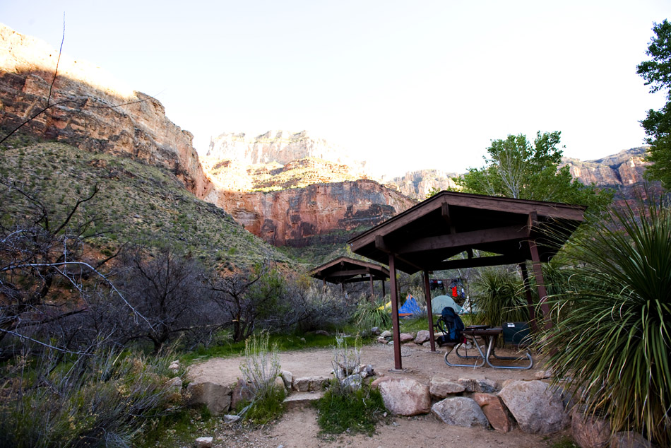 | Indian Garden is a back country campsite, to be sure, but it is a very well equipped one. There's drinkable water, picnic tables under roof, tent pads, and composting toilets. The sites are so designed as to provide as much privacy as possible. You will definitely enjoy Indian Garden, especially if you're an experienced backpacker and have endured much worse in many national park back countries. Our only caution is that this is a heavily used campground year round and the tent sites are packed fairly hard. You need stakes and a hammer which can penetrate rock hard ground, and you'll need a nice soft air mattress or sleeping pad. We have a friend who takes four railroad spikes and a sledgehammer when backpacking in the Canyon. We don't want to carry quite that much added weight, but you get the point. You're not going to be able to hand push lightweight aluminum stakes into this ground. | ![]() |