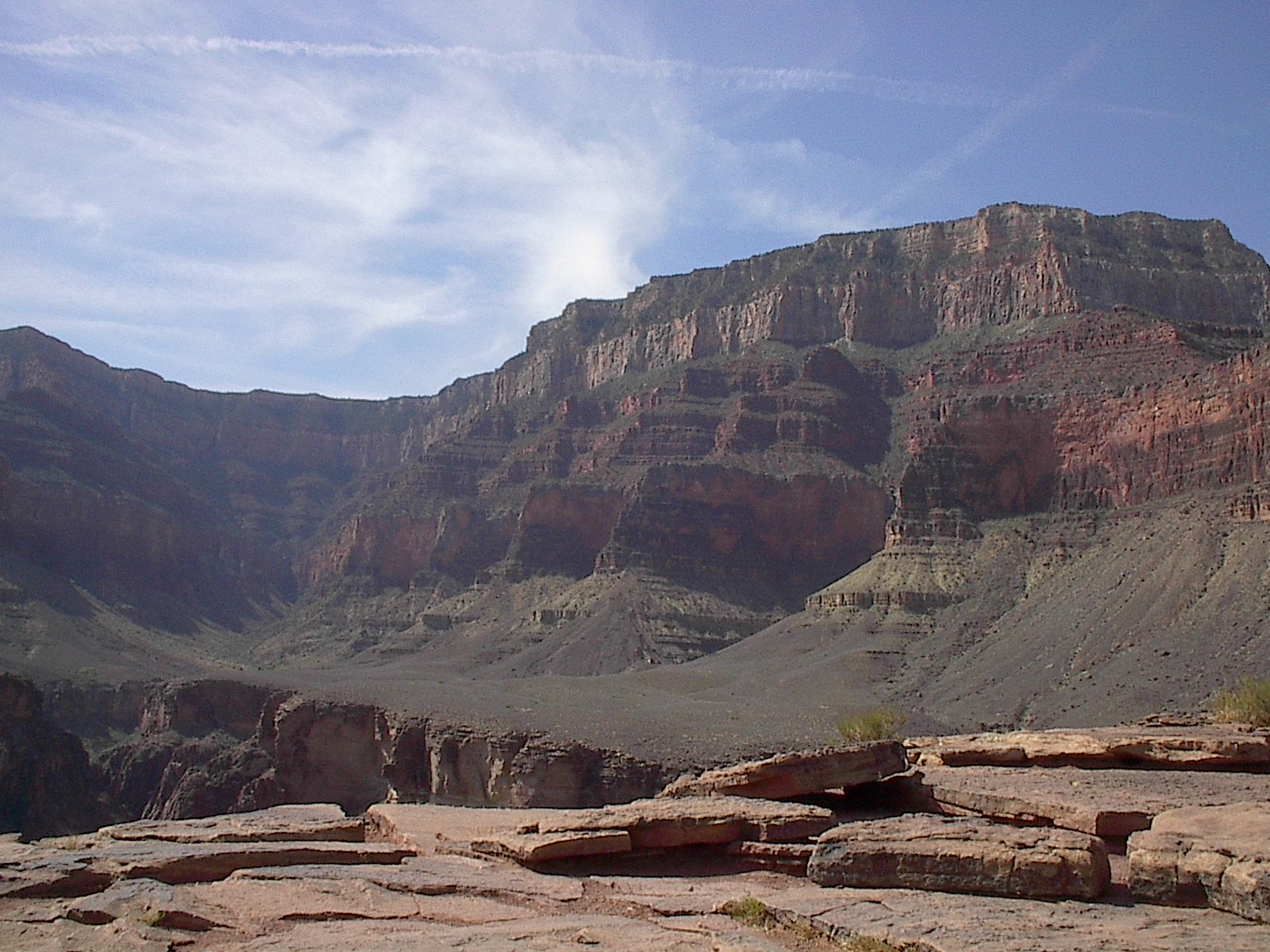| Jumbled rock layers mark the boundaries of Plateau Point. This photo looks North, across the river toward the North Rim. In the foreground, barely beyond the rock layers at your feet, is the edge of the cliffs dropping down to the river's edge. Walking over to the edge here, you can look directly down on the river. Back in the day hiking section, we recommended the hike out to Plateau Point as part of a day hike to Indian Garden. If you did not do so then, you really should do so now. It's a mile and a half from your tent out to the Point, making a three mile round trip. It's really a 30 minute stroll either way. If you were to turn around right here, you could also take some incredible photos looking back up at the South Rim, especially of Yavapai and Grandeur Point. Plateau Point is also a great place to watch or photograph sunrises and sunsets. | ![]() |