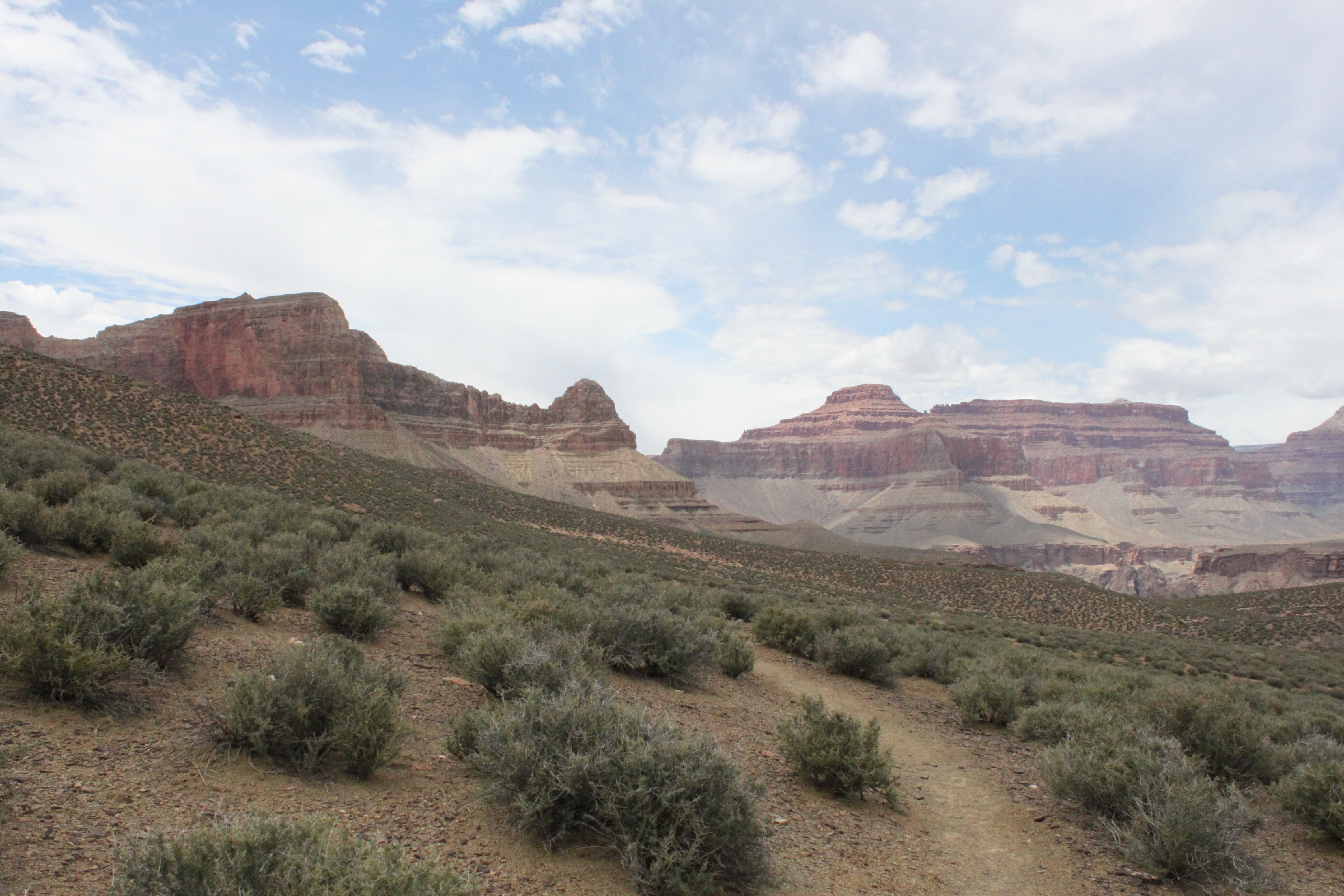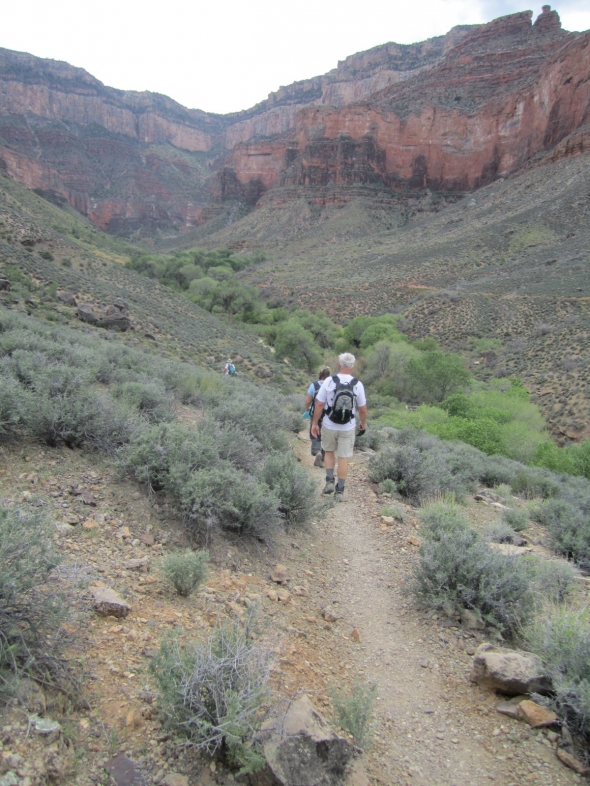 The average backpacker takes 2-3 hours to climb from Indian Garden to the Kolb House back on the Rim. (Obviously if you're experienced and in top physical condition it will take less; it's only five miles.) It is definitely advisable to leave early and try to make that climb in the morning. Between noon and 3 pm Jacob's Ladder can be extremely hot, especially in the Summer. The photo at left shows what you'll be looking up at as you leave the Garden. There's no part of it that is particularly steep but it is relentlessly uphill. The good thing about it is the rock formations and plants are fascinating and you'll be moving slowly enough to study them up close and in great detail. We advise everyone to bring along a book on Canyon Geology and Canyon Botany and on your rest stops pull them out and learn about your surroundings. It may sound a little geeky, but you're hiking through the whole history of the Earth and it would be a shame not to take advantage. |