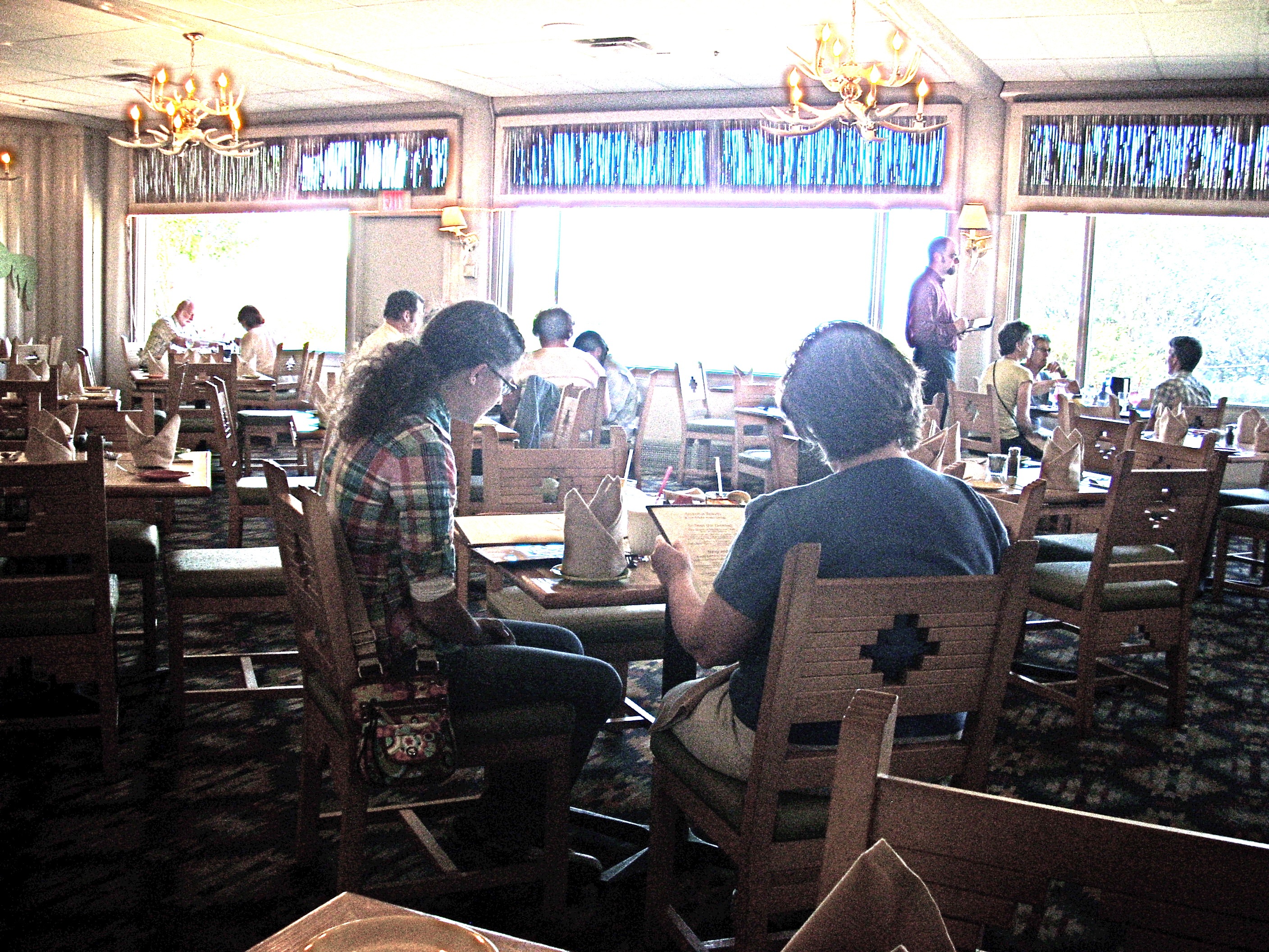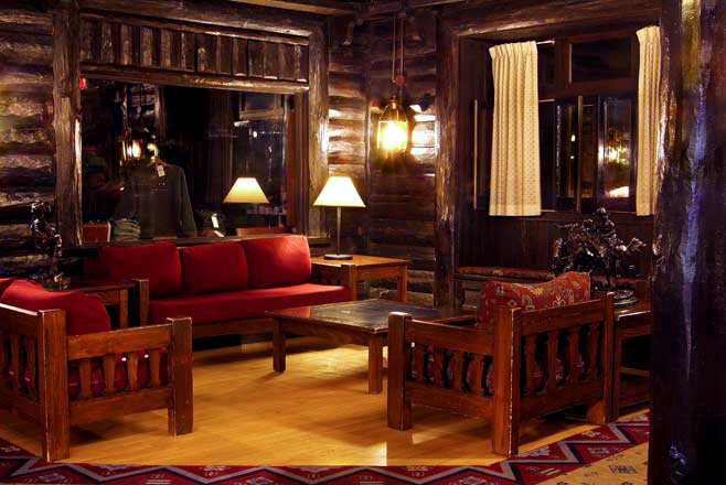 There are five very good restaurants on the South Rim, one on the North Rim, and one at Cameron Trading Post just outside the park. If you're here for a week or two and want to explore the area, there are also good restaurants in Williams and Flagstaff. Accept the fact that at any restaurant in the park, prices will be higher. National park concessionaires pay a franchising fee to the park service over and above all their other expenses. They are off the established trucking routes, so shipping produce in costs more. Staff is hard to find and keep, which drives up wages. And these are not large volume restaurants. However, the prices are within reason. Service and food are very, very good. And especially on the Rim, ambience is hard to beat. It's not every day you get to eat with such a view or in such historic surroundings. Remember demand is high and seating is hard to get for the three Rim restaurants. You need to make reservations as part of the same phone call where you make lodging reservations. If not, you can often get in as a walk up if you arrive at 4:30, since most people are out on the trails and don't get to the restaurants until about 5:30. Later in the evening, however, without reservations there is no chance. At right is the lounge just outside the El Tovar Dining Room. |