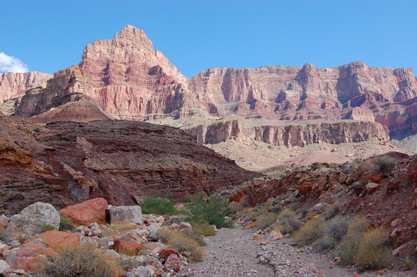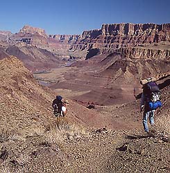 | The Tanner is generally recognized as the hottest trail in the Canyon. It has very little vegetation, zero water, and miles of reflecting light colored rock layers, so you are in effect hiking through a microwave oven. In June, July and August temperatures between noon and 3 pm average 120 degrees. This is the closest thing to pure desert hiking the Grand Canyon offers. Even the breezes which pick up in mid afternoon blow hot. Obviously, the time to hike the Tanner is April, May, October or November. No veteran hikers tackle it in Summer. | ![]() |