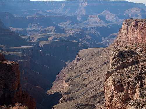 | The Tanner Trail is another of those well kept secrets that only hard core backpackers and hikers use. It's the easternmost official trail on the South Rim. The Tanner is considered Advanced, and it does have some rough spots, but it is certainly not as hard as the New Hance. It goes 10.4 miles down to some beautiful dunes and sand bars on the Colorado River, but of course you won't get that far on a day hike. Both the top right photo and the one here at right show the trail dropping toward the Tanner Creek Canyon. That's the Tanner to the left, a whitish trace visible once, then again much further down. | ![]() |
