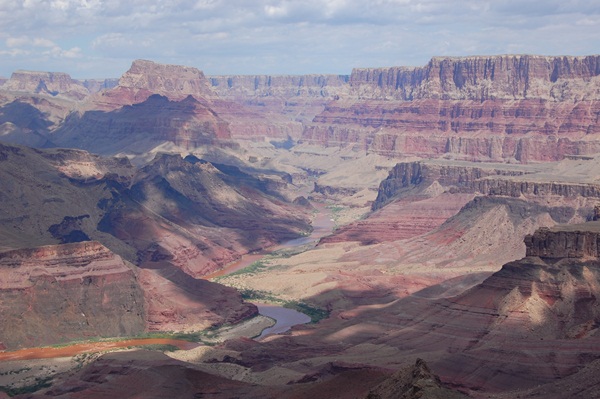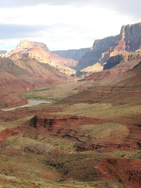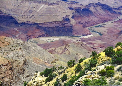 | This is the furthest you can descend on a day hike. You're looking at Cardenas Butte, named for Garcia Lopez de Cardenas, first lieutenant to Coronado. Acting as Coronado's proxy since the Conquistador's arm was injured in a battle against the Zunis, Cardenas and a small group of Spaniards descended the Old Hance Trail, visited the river, and climbed back out via what would become the Tanner Trail. They thus became the first Europeans to see the Colorado. The butte can be climbed without much trouble and the top makes for a great lunch stop. As with Escalante Butte, the views are wonderful. Turning here gives you a seven mile round trip. That's the Tanner Trail in the lower foreground of the photo. Even if you don't climb the butte, from the trail you can see the views below. At left you're looking back up at the South Rim. That bump in the center is the Sentinel Tower at Desert View. In the center you're looking eastward toward Comanche Point. It and that wall, called The Palisades, are the boundary of the national park and the Navajo Nation. At right you're looking northward along the river toward Marble Canyon. | ![]() |