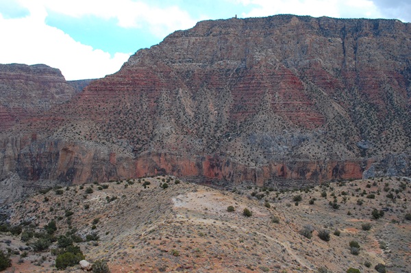 The entire time you're on the Tanner Trail the Sentinel Tower at Desert View will be looking down on you. The Anasazai had good reason to build the tower on that spot, now called Navajo Point. At 7438 ft. it was and still is the highest spot along the entire South Rim, and the tower itself is several hundred feet higher. (The North Rim is a thousand feet higher along its entire length). Lookouts could see every trail and side canyon between the river and the South Rim and out across what is now the Navajo Reservation. Anyone visiting the tower with a good pair of binoculars (and remember there are coin binoculars mounted on the railings) can watch your every move, including lunch and potty breaks. If you want privacy, you need to duck around behind any buttes or rock formations. If you can see the tower, they can see you. |