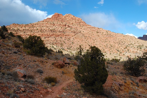 | This is your second major stop at 2.7 miles down. The formation right next to the trail is Stegosaurus Rock. Behind it is Escalante Butte. Many energetic hikers come this far, then climb the butte and have lunch on top. The views from up there are great, and you can climb it without ropes, but there's no trail and you'll be scrambling most of the way up and sliding back down. A lot of day hikers turn around here for a 5.4 mile round trip. However, we still urge you to keep going. |