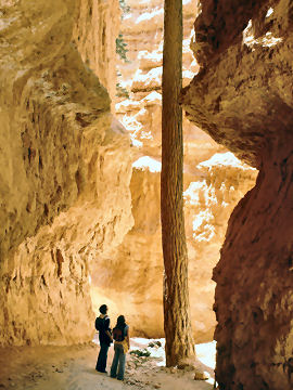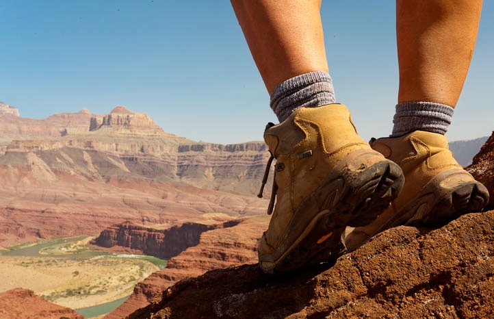 Your Feet are your next concern. Along the Rim, you'll be hiking level terrain, but the trails are paved. This makes for smooth hiking, but it heats up in the bright sun and the heat transfers up to your feet. The pavement is also hard, not the soft cushioning dirt of forest trails. Below the Rim, you'll usually be either hiking steeply Down or steeply Up. The sand and rock also absorb and transfer heat. The trailbeds contain a lot of loose sand, gravel and rocks. So your feet will take more pounding, twisting, heat and pressure than they're used to. Even for day hiking, you need good boots, with leather uppers and strong arch and ankle supports. Pay attention to the scree collars. Many boots don't have them, or have poor ones. You need good ones here. Wear two socks, one thick and one thin "liner." Thoroughly rub talcum powder into the feet before you start, then put on the liner sock, rub more talc into it, and finally put the thick sock on and rub talc into it. Every hour, stop for a drink, take off your boots and change socks, retalcing the feet and each sock as you put them on. We highly endorse Moleskin. Carry a small pack with its scissors. If you develop a hot spot, cut a Moleskin pad tofit and put it on. Done in time, this will usually prevent a blister. |