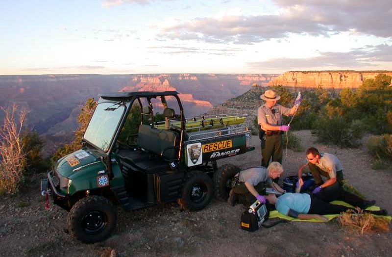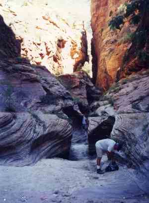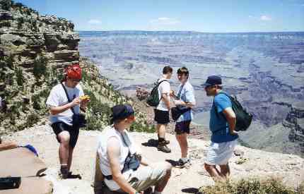 The Heat at the Grand Canyon must be dealt with. Every day during the Summer months people need treatment for, and sometimes hikers need rescued from, Heat Prostration. Sometimes the line gets pretty thin between Dehydration and Heat Prostration, and one can lead to the other. But you and your hiking partners need to continually monitor yourself and each other. Every time you stop, do so in the shade. We highly endorse Neckerchiefs. Every time you pass a water source, soak the kerchief, then tie it back around your neck. As it evaporates, it creates a cooling effect. If you really have trouble with heat, buy one of the absorbent hats that you can soak in water and put on. Again, as it evaporates, it cools you. Headaches, nausea, dizziness, and leg cramps are warnings that you may be overheating. At the first indication of any of these, STOP at the first shady spot, drink and rest. One problem is people ignore symptoms because they don't want to slow the group. But if you collapse, you'll ruin the group's whole day. Much better to stop briefly and recover. |