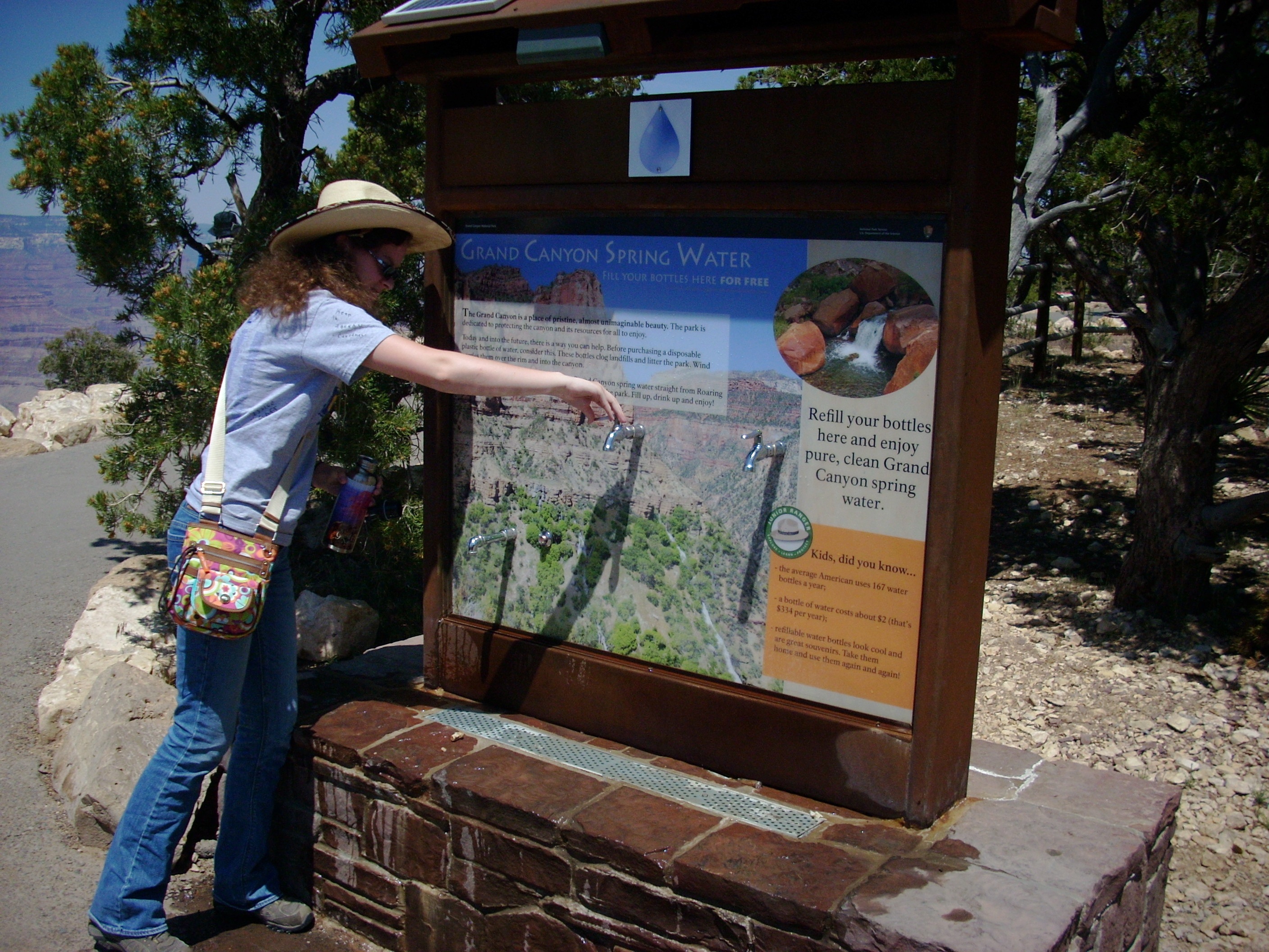Your third concern needs to be Dehydration. If you're carrying one of those little belt weather meters, you'll notice there is almost zero humidity here. The dry air will suck the moisture from any surface. This includes you. You'll notice you don't really perspire here. Your sweat glands, of course, are working hard. But as soon as those drops of perspiration reach the air, they evaporate. So you don't realize how much water you're losing. People and even dogs faint here every day from dehydration. It's one reason so many hikers below the rim need to be rescued. To avoid this, you need to drink plenty of fluids at each meal for several days beforehand so you build a reservoir of water. The morning of your hike, drink as much as possible. Then carry at least TWO water bottles. They sell them at every shop and even the cafeterias at the Canyon, but theirs are small mouth single wall plastic and metal bottles. We recommend you buy large mouth double walled metal bottles back home before you come. There are water stations every mile along the South Rim Trail and three times between the Rim and Indian Gardens Campground on the Bright Angel Trail. Use them. |