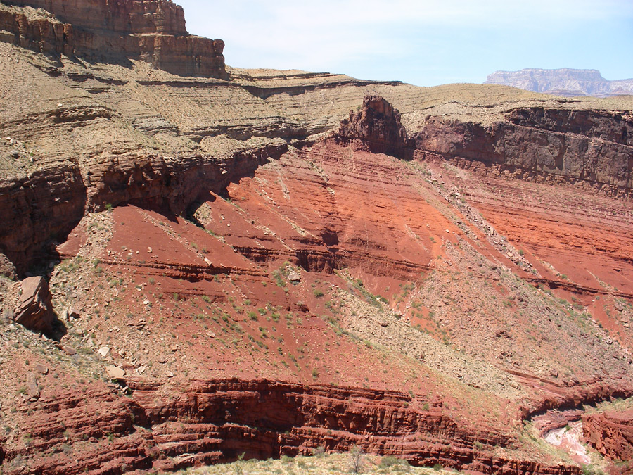 | As you descend into the Red Canyon, you'll be confronted by this scene. This is The Great Unconformity, a massive fault. In between that tilted red layer coming up from the right and the level Bright Angel Shale is a gap of half a billion years of geologic history. This scene is clearly visible from Moran Point up on the Rim, and telephoto photos of it are commonly used in texts on Geology or Earth Science. Anywhere in the Grand Canyon is a good place to study Geology, but the Red Canyon is one of the very best. | ![]() |