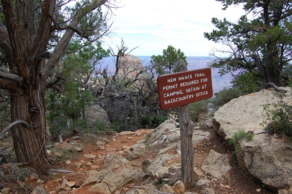 | This is the oddly placed New Hance Trail sign, five minutes in from East Rim Road. Since the New Hance Trail is so rugged, few day hikers bother with it. The rewards for all that hard work are the incredible scenery down below, getting to camp on the beach at the New Hance Rapids (the most challenging drops on the Colorado River), and access to the eastern section of the Tonto Trail. As a day hiker you can't get down that far. So most people don't bother with it. The few people you'll see will be carrying full packs and planning to spend two or three nights down in the Canyon. However, we think it is a great one day outing. You just have to approach it, not as a hike, but as a day of playing on the rocks in the heat. And even as far down as you're going to get, you'll have some incredible photographic opportunities. | ![]() |