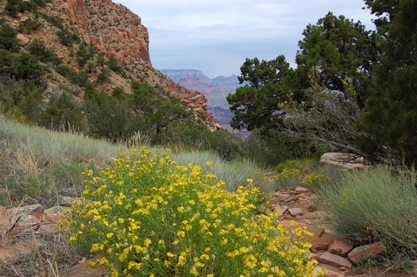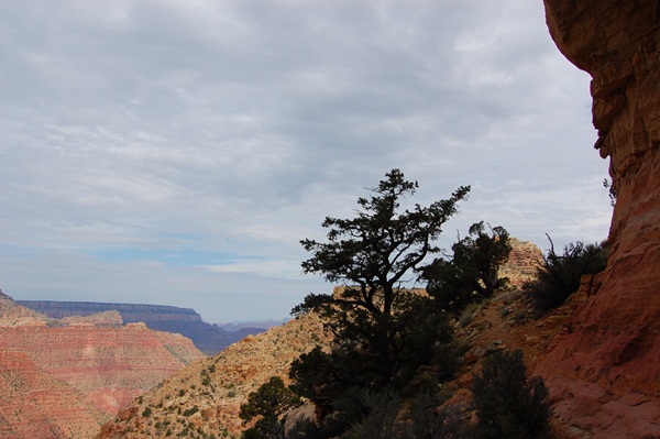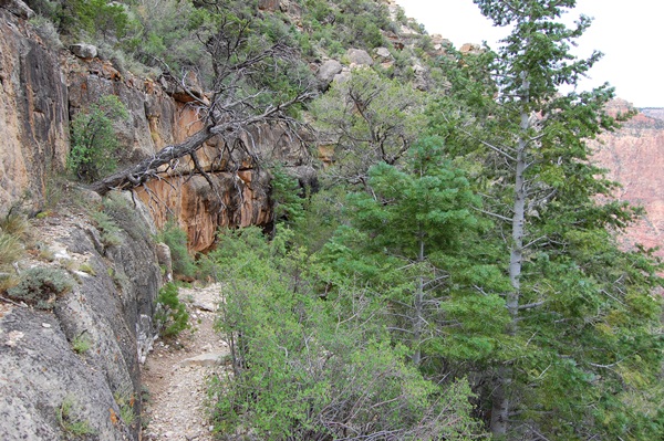| You start dropping immediately and the intensity picks up around every turn and switchback. The New Hance does not receive the frequent maintenance of the other trails. The trailbed is narrower, undergrowth presses in from the sides more aggressively, and downed trees and branches will force you to climb over, duck under and pick your way around. | ![]() |
