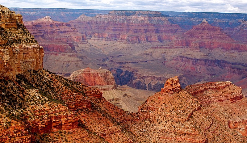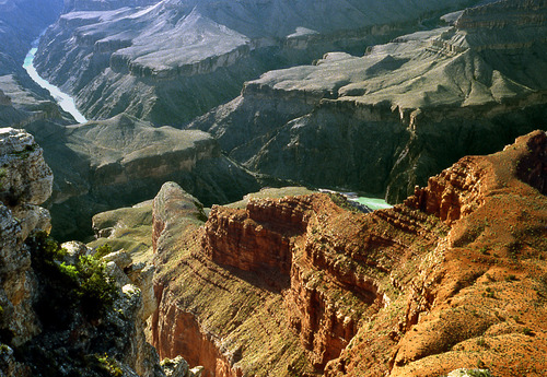 When you look West from Mohave Point this is what you'll see. Notice that the canyon has angled around to face the West here, which is why these are the best places in the park to view sunsets. That's Cope Butte out there partially blocking your view of the river. |