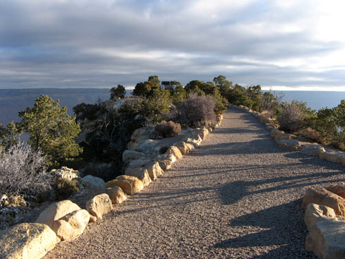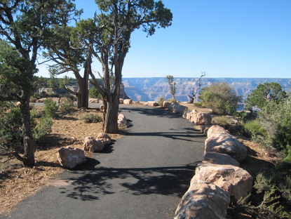 | To begin the West Rim Trail, take the Village Shuttle (blue) to the Bright Angel Lodge. Walk around or through the lodge, turn left, and walk past the Bright Angel Trailhead (the Kolb House), and just keep going. The trail will climb a rather steep hill and veer to the right toward Maricopa Point. The top two photos are at Maricopa Point. This photo at right shows the path out to Powell Point. It's the next observation point beyond Maricopa. The John Wesley Powell Monument is at the end of this path. | ![]() |
