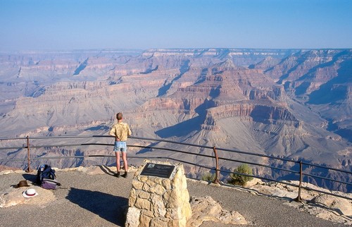 | The West Rim Trail extends nine miles from the Village to Hermit's Rest Visitor Center. It features nine observation decks, nine bus stops by shuttles running along the Hermit's Rest Road, three portable rest rooms, and two drinking fountains. There's an extensive fast food restaurant at Hermit's Rest. A massive renewal project in 2008 redid the road, trail, observation decks, railings, walls, and even landscaping for the first time since 1935. The trail itself varies. The final three miles, from Pima Point to Hermit's Rest, is state of the art. The eastern segment, from the Village to Hopi Point, was paved in 2008 and is in great shape. In between, the trail is not paved, and ranges from dirt to rock to gravel. It is often rough and close to the edge. So hiking the West Rim Trail is somewhat of an adventure but is still worth it for the great history and views. | ![]() |
