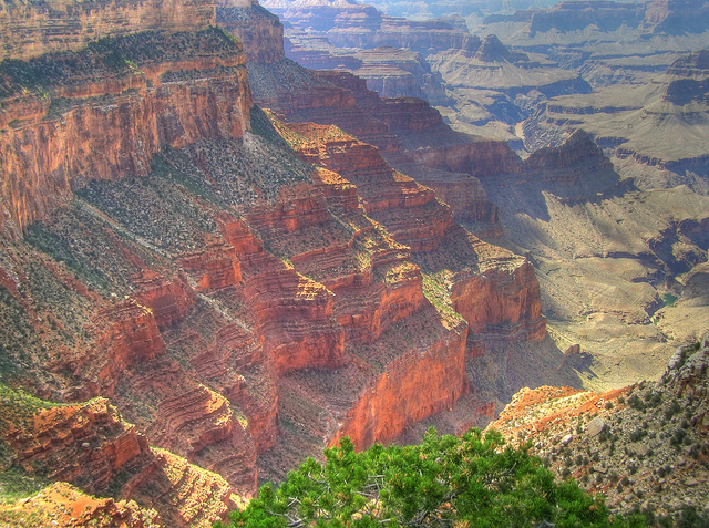 | The Abyss is one of the most photographed spots along the South Rim. It's where the South Rim Mule Ride stops for lunch. They ride over through the forest for two hours, then dismount here to rest, eat and take pictures. This is actually the head of the Monument Creek Valley. You can see Monument Creek carving its way toward the river in the center right. To its left is Cope Butte. A little to the left of where this photo was taken you look straight down into the canyon. The whole South Rim is full of breathtaking views but this may be the most heart stopping of all. Signs warn parents to keep a hand held with their young children. This is also one of the most photogenic views of the layering of the Redwall formation. | ![]() |