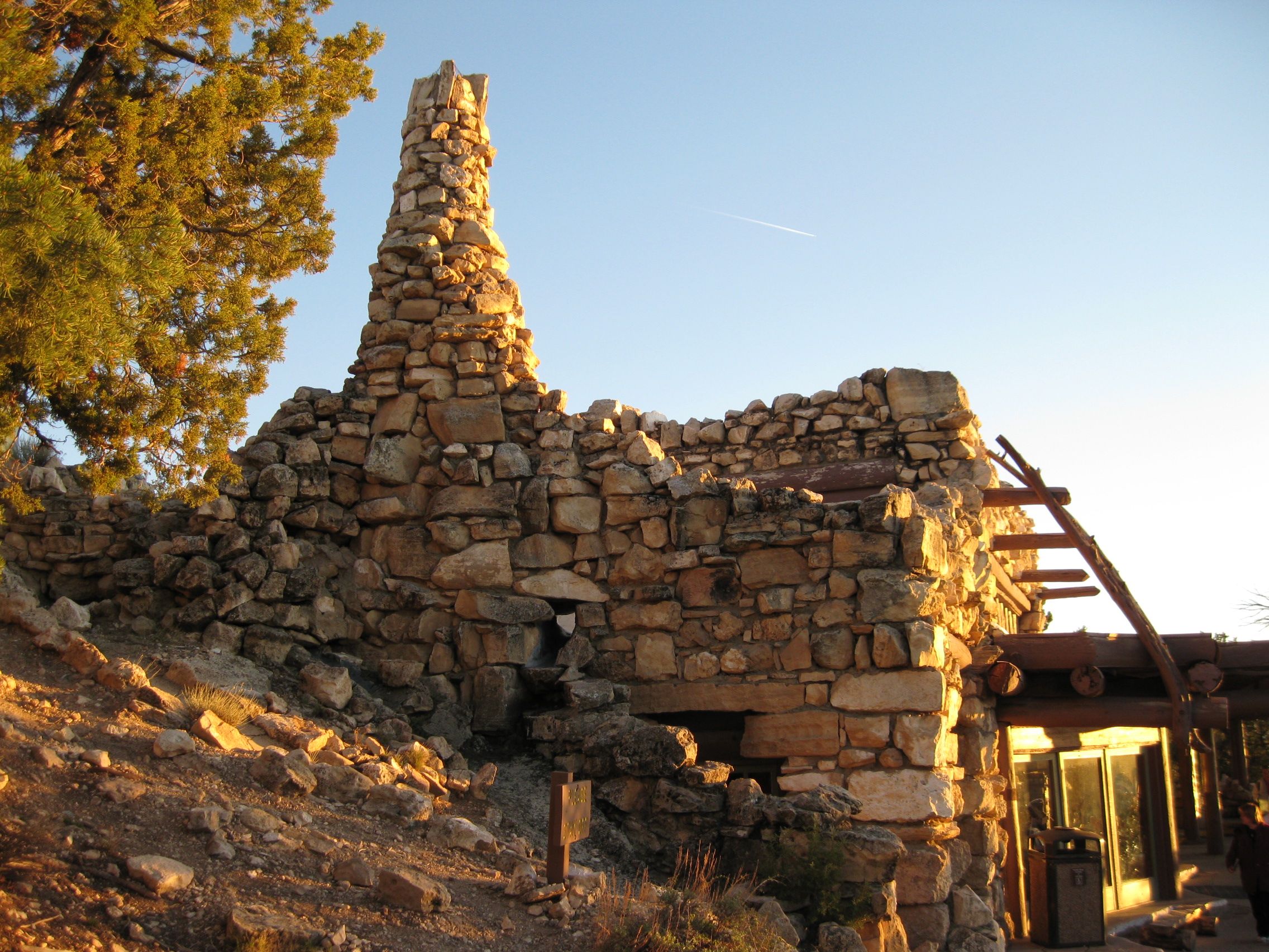 | This ramshackle looking pile of rocks is actually Hermit's Rest. At first it appears to be an old prospector's home, but in fact it was designed by Mary Colter and built in 1914 by the Fred Harvey Company. Colter intentionally designed it to seem like that old prospector's home. Inside, it has a huge fireplace and other rustic features. There's a snack bar, gift shop and observation terrace. The views are incredible, but after hiking nine miles along the West Rim Trail most people have begun to take such views for granted. This is the furthest West stop by the shuttle buses, which turn around here for the run back to the Village. This is the end of the West Rim Trail and the beginning of the Hermits Trail and Dripping Springs Trail. | ![]() |