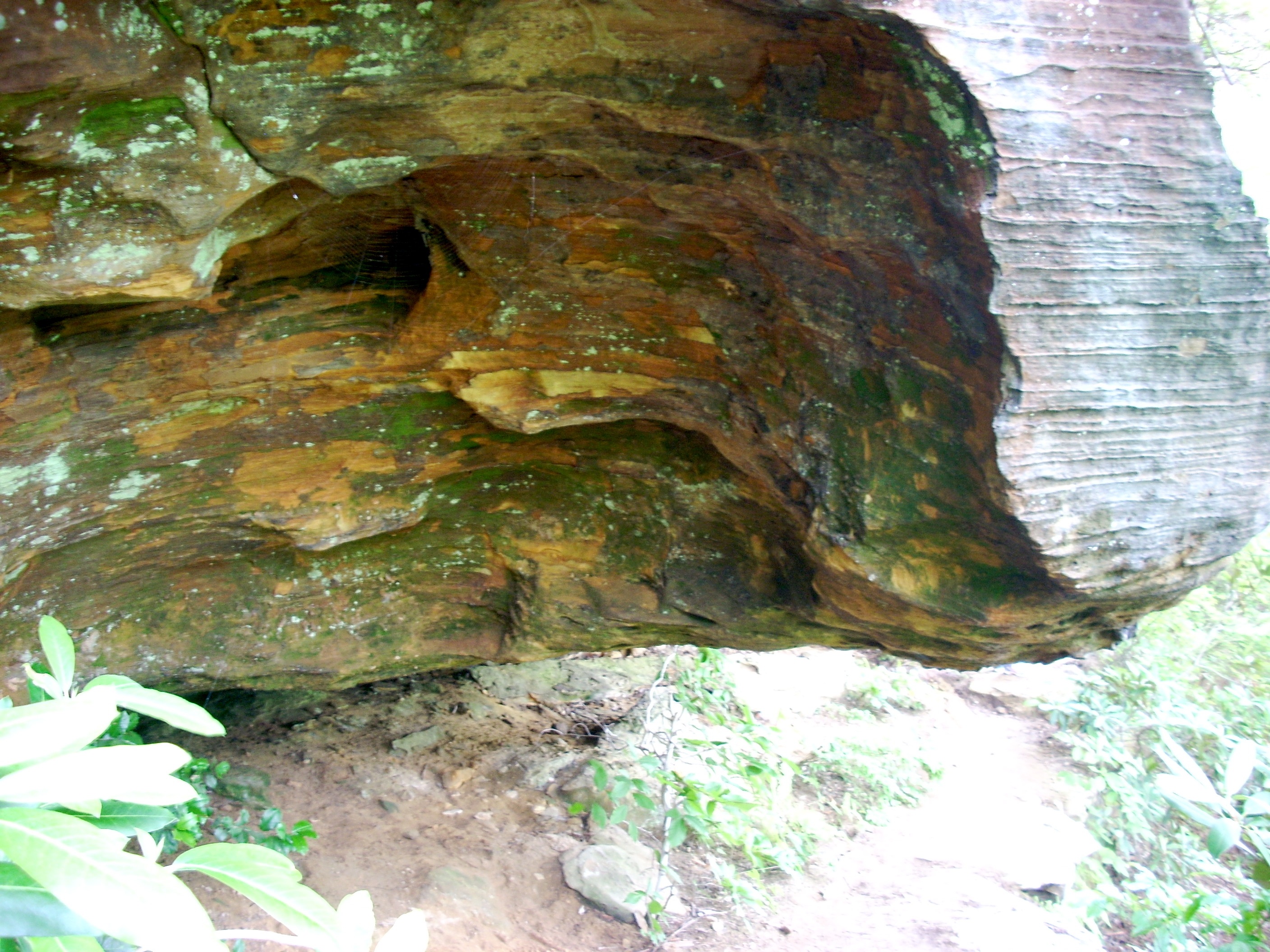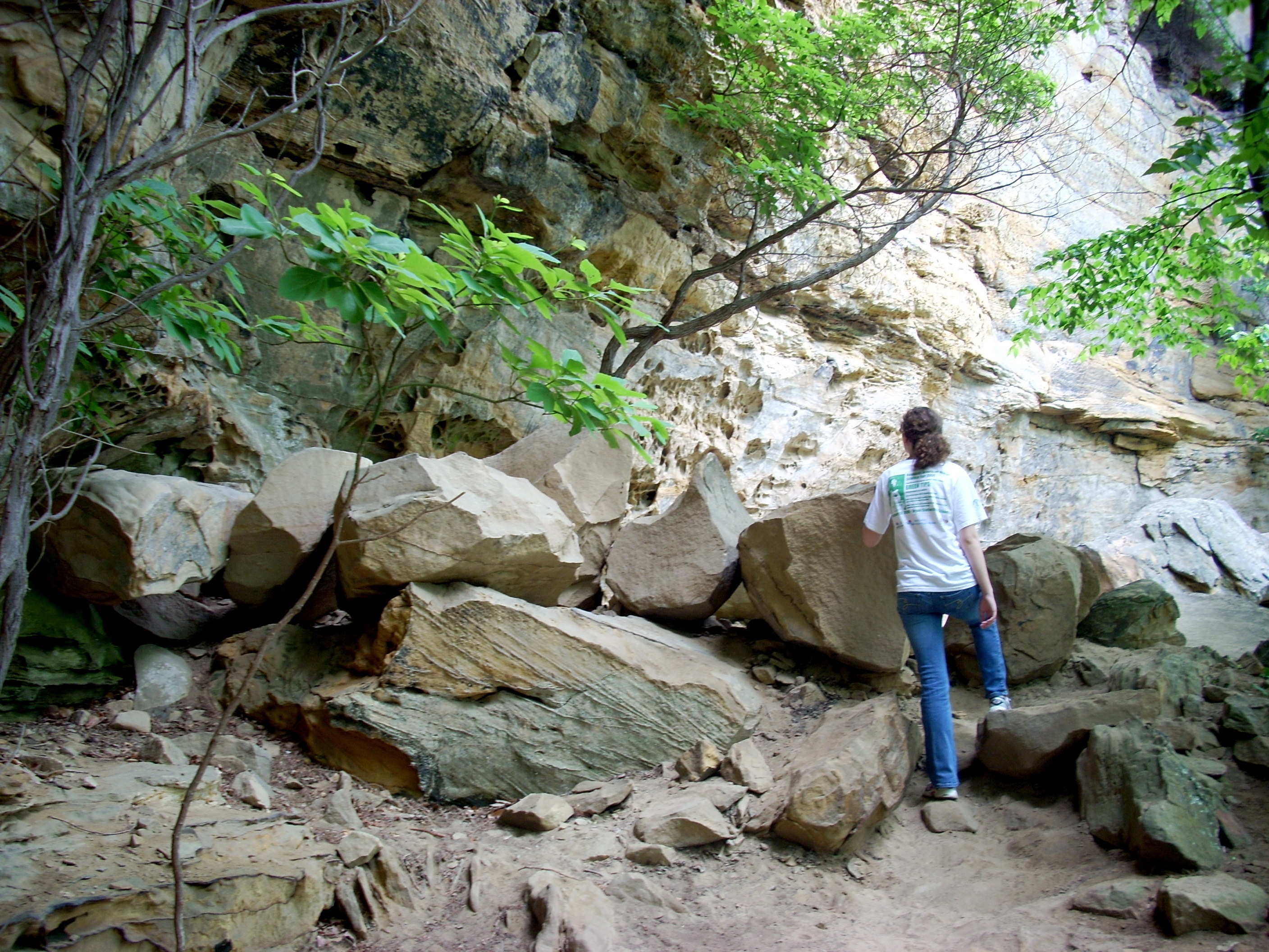 The trail winds through weird arrays of fallen rocks and passes large rock shelters in the cliffs on the left. Archaeologists have determined that these shelters were occupied by the Adena Indians for several thousand years. They preferred the high cliffside dwellings for safety and security, hunted the surrounding forest for game, and farmed the level areas down in the valleys, which they kept clear by annual burnings. |