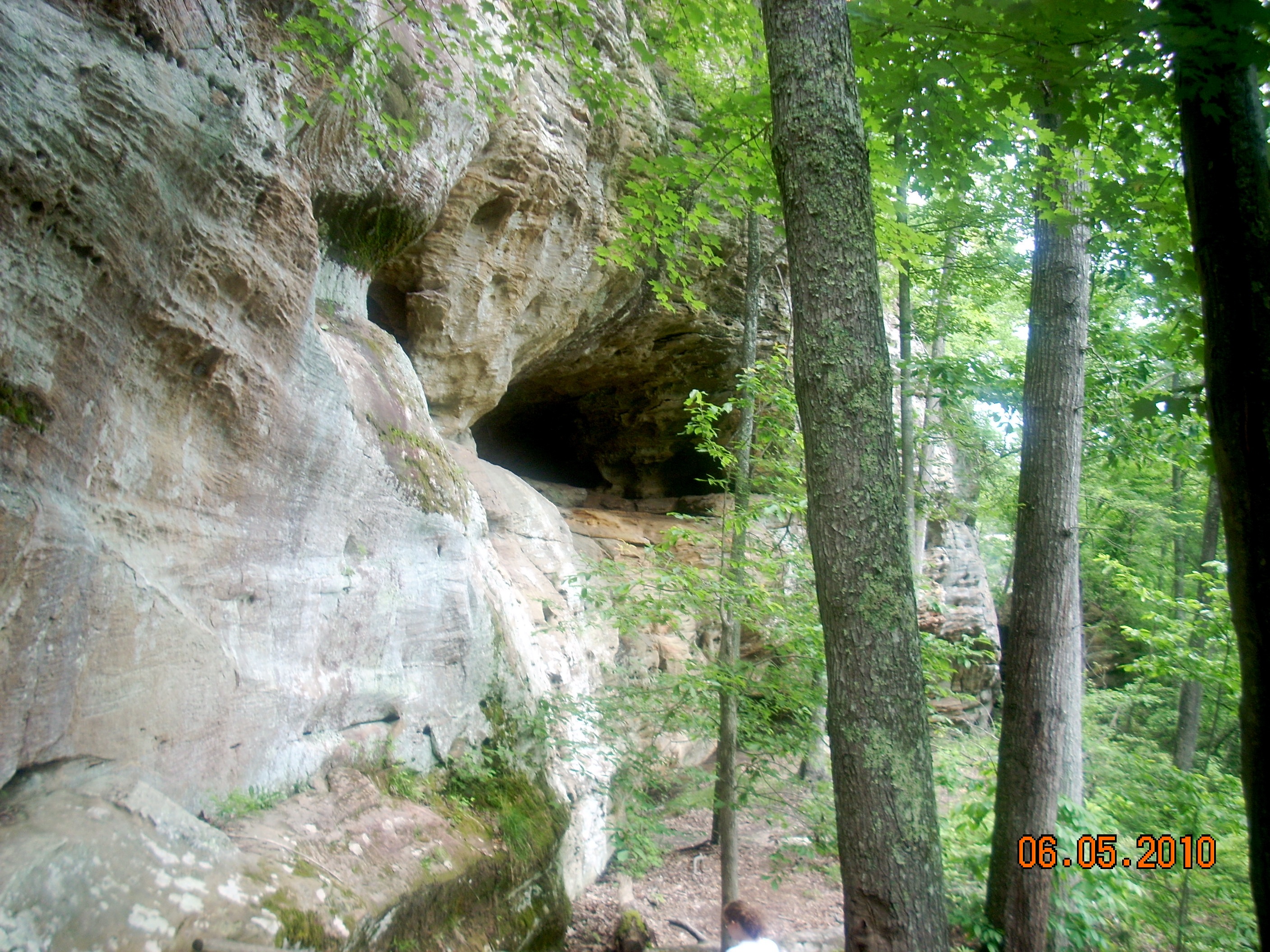 This beautiful natural rock shelter was once the home of an Adena chief, according to archaeologists. It is also an example of how the land has changed over the years. When the Adena lived here, the floor of this shelter was perfectly level all the way to the back. Today, the floor has been eroded and has a gradual but steady slope, so it would not be nearly as pleasant a home. The Adena were a peaceful agricultural tribe that retreated into the Gorge to avoid continual confrontation with the Shawnee and other more militant rivals. They would station lookouts on the ridges while the women and children worked the fields on the valley floors far below. If the sentries detected anyone approaching in the distance, they would use smoke signals. Down in the fields, one reliable child would be assigned to just sit and watch the ridge. If they saw smoke signals, they would sound the alert and everyone take their tools and retreat to the cliffs. The Adena raised corn, squash, beans, pumpkins, carrots, peppers, onions, tomatoes and sunflowers, although their crops were slightly different from the hybridized versions we use today. The larger streams in this area supported catfish, perch and bass. Deer were plentiful and provided both food and clothing. |