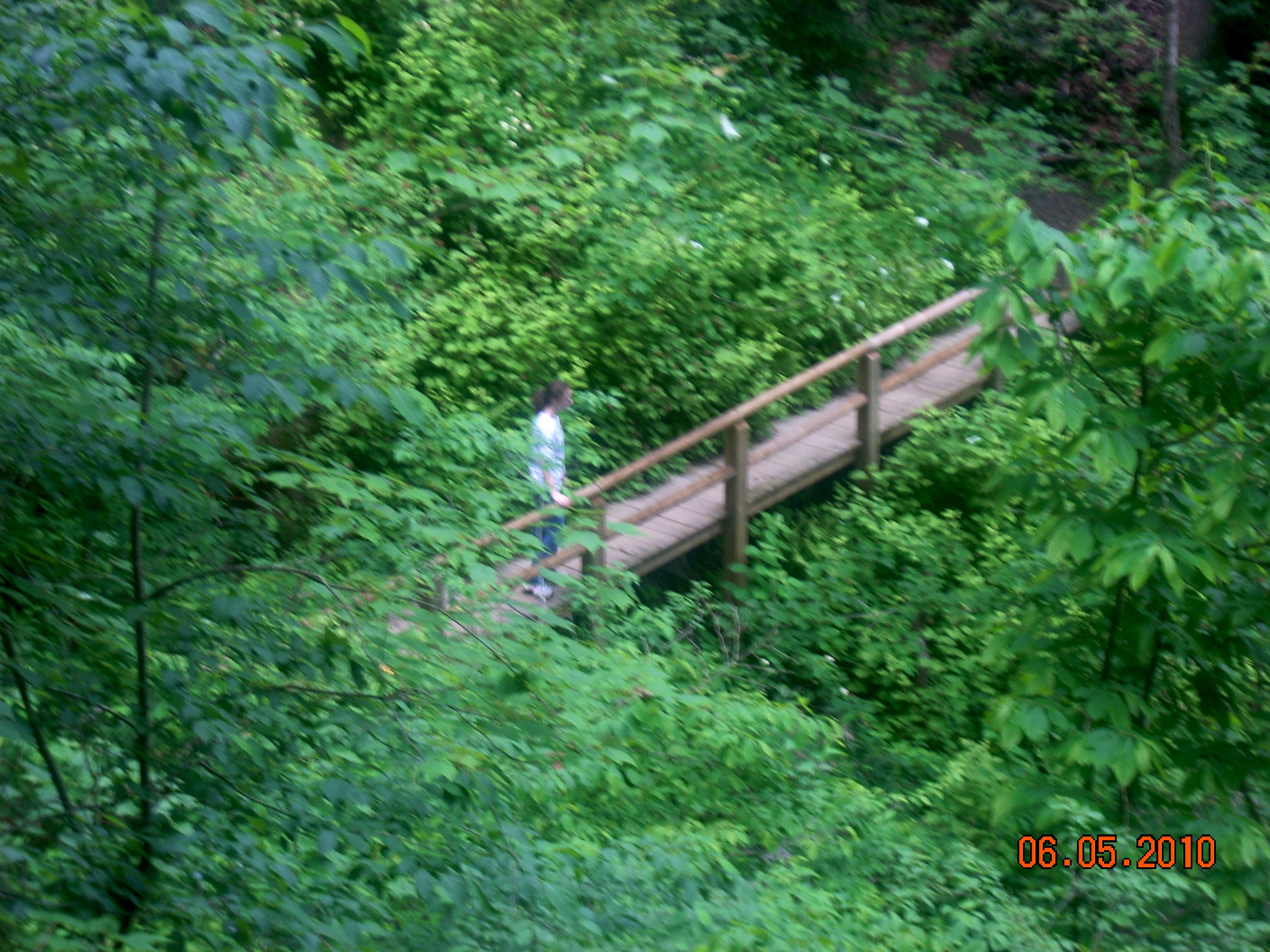 This is The Canopy, another spectacular section of the Battleship Rock Trail. The trail comes off a ledge to the treetops of the trees growing up from the valley below. A narrow "hanging staircase" descends through the canopy to another rock ledge, where you then cross a bridge over a final rock cut to solid and reasonably level ground. If you bring a flashlight with you to help getting back to the lodge, this is an incredible place to come in late evening and sit on the stairs as darkness falls. It's a bird watcher's paradise and is especially good for Whippoorwills. Descending this staircase is an especially beautiful experience in Spring and Fall. In the Winter it's pretty hairy and in the Summer it's usually hot and humid. But when all the leaves are in their October display, you descend through a fireworks display of colors.