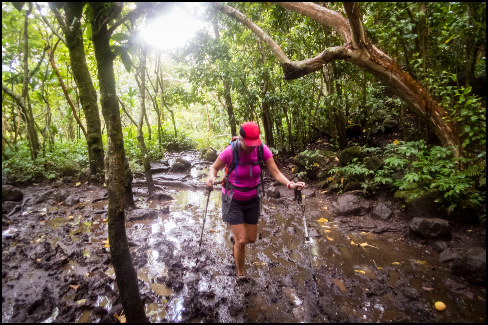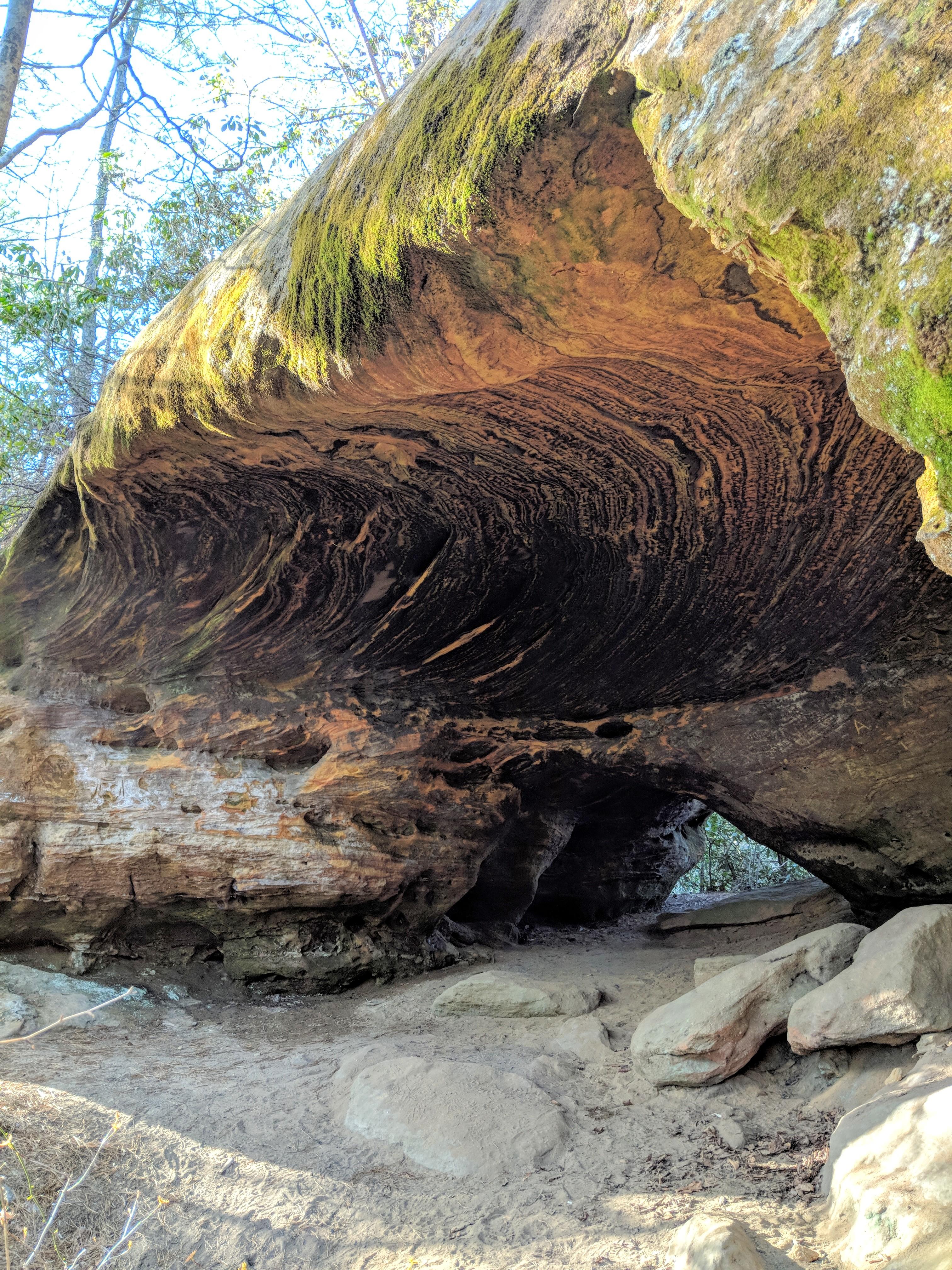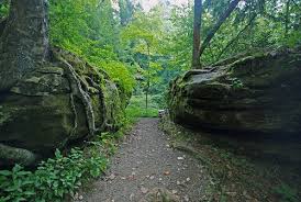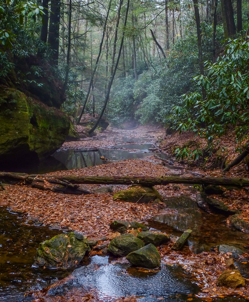 About a mile of this brings you to Dog Fork. In dry weather, this is one of the most scenic spots in the entire Gorge, especially if you leave the main trail and wander upstream around a few bends. In wet weather, it is your worst nightmare, an unending bog of knee deep goo with so many crisscrossing trails it can be hard to find the true one. As you descend the steep trail with the boulder to your right and prepare to cross Dog Fork, take a minute to look across. The true trail goes straight ahead, then climbs the mucky slope until it comes out on a gray mud ledge under a sandstone cliff. It turns left and follows along under the cliff until it comes out on dry ground. The Forest Service and various volunteer groups keep building bridges, steps and railings to help hikers, but they keep vanishing into the quicksand like mud. Whether any of them are in place to help you is a matter of luck.