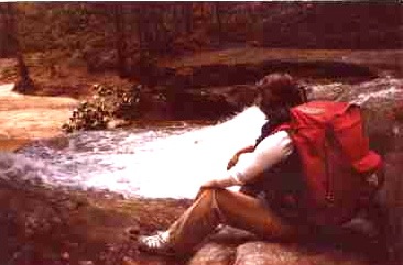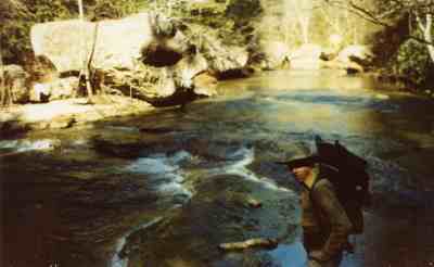 In addition to your usual hiking supplies, we suggest extra changes of socks, a fluffy towel, and a pair of river shoes, Wellingtons or waders. The mud can suck sandals or loose fitting boots off. When you come to one of the mucky sections, you're better off to stop and change, then stop and change back after the crossing, to protect your hiking boots. In any event, the trail begins across the road from the Parched Corn Creek Trailhead and parking lot and heads East. The first mile crosses a level plateau through beautiful open forest. Then it drops down off the plateau, a 300 foot descent in a third of a mile. As you enter the valley, you will notice a tremendous amount of blowdown off to your right, and you may find trees or branches blocking your own path. At the very bottom of your descent, the trail comes through a very steep 40 foot chute, then levels out on the flood plain of Swift Camp Creek. Watch carefully. The route appears straight ahead, but that is a spur people use to fish or picnic along the creek. The through trail cuts sharply right and drops to a grotto and a side stream. You climb around a large boulder and descend a series of steps carved into the stone. This brings you to the main creekside. The trail then sets off on its six mile southern journey along the stream. If you enjoy sitting with your feet in the water, wading, swimming, rinsing anything out, or refilling your canteen (after purifying), do it here where the trail is so close. From here on, the terrain will grow much rougher, and while the stream will be foaming and gurgling far below, cliffs, steep banks or scree slides will separate it from the trail. You'll cross several beautiful side streams, as shown by the one at left, but you never cross Swift Camp Creek and rarely even drop down to hike alongside it. |