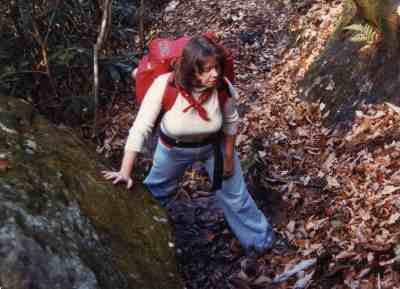 You'll climb a shoulder and hike along it for a while, turn right and head up the Wildcat Creek drainage, dropping slowly down to the stream crossing. Then the trail angles steeply up the hill to the intersection with Wildcat Trail. This could be considered an escape route. You could switchback up to the plateau above, hike a mile out to the road, turn right, and follow it a mile to your vehicle. However, the main trail swings around a rocky outcrop and continues southward. At this point the scenery changes abruptly. The trail rises and falls, twists and turns, crossing streams, wet spots, and logs, all the while threading its way through rhododendron thickets, large rocks, and banks. Above you, high rocky crags jut skyward. Everywhere huge boulders peek out from dense foliage. If the producer had decided to film Lord of the Rings in America, this would have been the place to do it. |