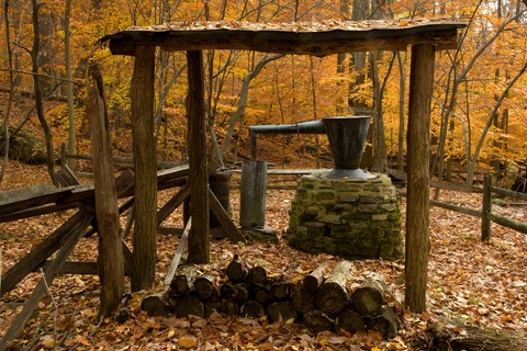 After the loggers cut the trees and left, the moonshiners moved in. Even before the big trees grew back, dense rhododendron thickets provided cover. The farmers could raise their corn up on the plateaus, then haul it down here and distill it into whiskey. Thus began half a century battle between the "whiskey runners" and the "revenooers," special agents representing the Bureau of Internal Revenue.It was not illegal to distill corn into whiskey, or to drink it or serve it to friends. But the farmers wanted to sell it, and refused to pay the taxes on it. The revenuers destroyed almost all the stills they discovered, but many were never found, and a few remain not far from this trail. A short trail to one leads uphill off Swift Camp Creek Trail just above Hells Kitchen. The one shown here is near Turtle Arch. | ![]() |