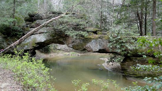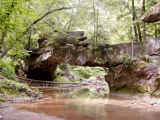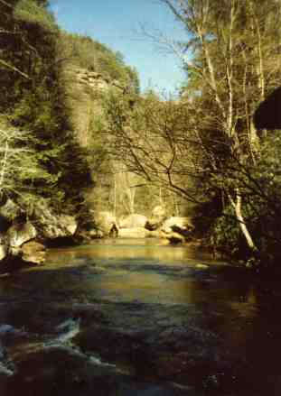 If you continue up the stream, as the canyon opens out again, you will wade directly underneath Rock Bridge (second photo from top and here at right), the only natural arch in Kentucky which spans a year round flowing stream. It is a jagged, unbalanced formation, but photogenic nonetheless. It would be a good place to climb out, dry your feet and put your socks and boots back on. The trail here is paved, as people often hike down from the parking lot just to picnic or photograph this arch. You could climb up, dry your feet, change back into your hiking boots, cross the bridge, and, to your left, enter the Calaboose. This is the wild, remote, trailless eastern expanse of the Gorge. In the Calaboose you could search for Castle Arch, Red Byrd Arch, and several spectacular waterfalls and white water sections of the Upper Red River, a famous canoeing and kayaking run. |