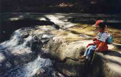 By following Swift Camp Creek around the bend, you'll come to Creation Falls, deserving a few photos. The trail in wet weather is difficult, but that's when the falls is most spectacular (see photo at top). A tremendous wall of water comes cascading down, and swimming is possible in the bank to bank pool below. In dry weather (shown here left and right) a mere trickle of water flows, and below it is just a wading pool. From there, you'll climb a quarter mile up the paved trail to the parking loop. | ![]() |
