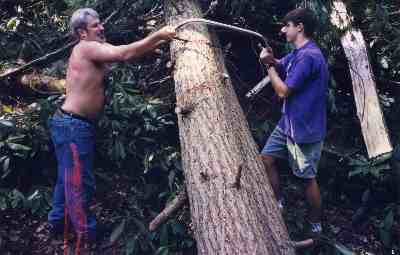 Anywhere along Swift Camp Creek Trail you may encounter downed trees. Strong winds and storms roll through this valley and the entire Gorge often, especially in the Winter and early Spring. However, you may also notice that there have been a lot more trees and branches down that have been cleared. Most of this work is done by local volunteers. One group assembles on weekends, camps out, and spends two days working on trails. Scout Troops, Venture Units, school groups and local businesses "adopt" a trail and devote one weekend a month to work on it. Like all national parks and national forests, the Gorge is seriously underfunded by Congress, so volunteer labor never catches up. But they help a lot. One problem is this is part of the Clifty Wilderness, so chain saws and other power equipment is forbidden. That means cross cut saws and other old classic tools must be used. With the large trees, this requires quite an effort. |