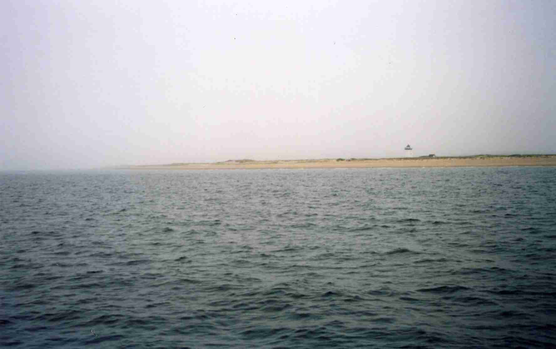From the base of the tower you can catch the shuttle out to Race Beach. It's a beautiful beach, even if you're only going for a look. The fact that you won't have time for a swim is ok, because this is a dangerous swimming location. The current coming up the back side of The Cape races around this outer curve very rapidly, making it dangerous for swimmers, surfers and boaters. You can walk down to water's edge and see how fast the water is moving to your left. However, looking out across the water, you can imagine the Mayflower, actually caught briefly by low tide, but refloated as the tide rose again. This very beach was thus the first sight of the new world the Pilgrims had. The view at left is looking toward the beach from a boat at the distance Captain Jones tried to keep the Mayflower so she would not be grounded, so this would have been the view the Pilgrims saw that first day, except of course for the lighthouse and Pilgrim Monument in the background. |