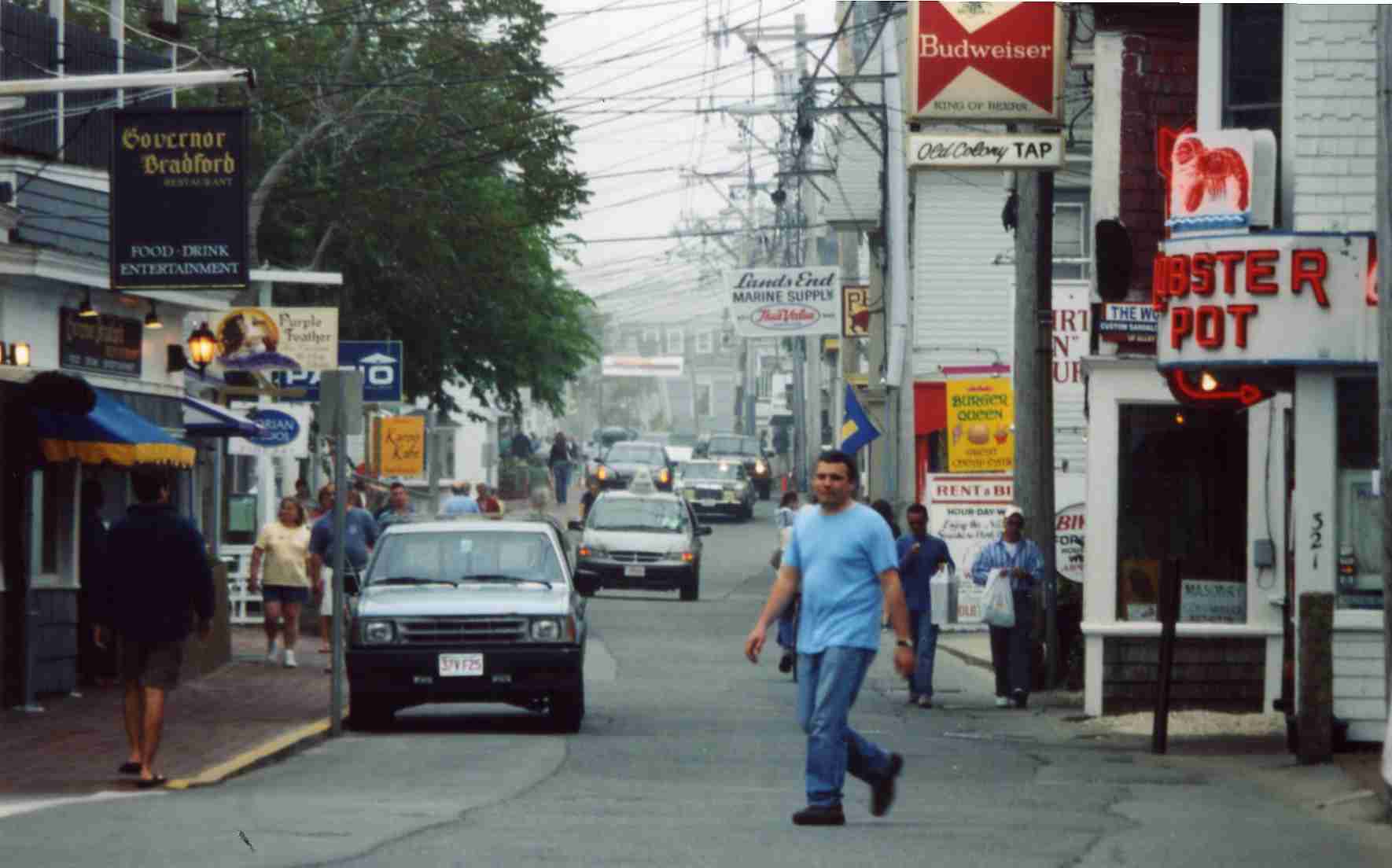 Once you finish eating, most of your time in Provincetown will be gone, but you should have enough left to browse a few blocks of downtown. This is Commerce Street, a narrow, 18th century conglomeration of art galleries, edgy fashion boutiques, tourist souvenir shops, and other eclectic establishments. Provincetown is still a fishing village and tourist stop, but it has also evolved into quite a year round artists and writers colony, and there are some very talented people here. Just brace yourself for some wierd sights. This would not be called a conservative community. Haight Ashbury East might describe it pretty well. |