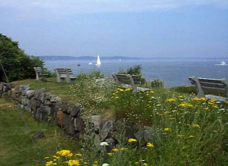 The only good camping in Salem is at Fort Pickering State Park, but it is a great location. There are rest rooms, showers, a camp store, tbenches looking out over the harbor (shown here), and huge, level, grassy and private tent sites. There is an old fort and several other historic structures to explore, a boat launching ramp which entertains you with sailboats and fishing boats coming and going, and in June not very many other campers. Pickering is an easy 10 minute drive from downtown Salem. The camp store closes early and is very limited, so you'll want to buy groceries elsewhere. Your tents should be sturdy and pitched well because the wind coming off the harbor can be gusty. And it can get worse than that. We don't camp in Salem anymore. We learned our lesson. We have kids along and we err on the cautious side. |