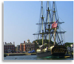 The Friendship is anchored directly in front of the Custom House, alongside Pickering wharf out from the Captain's Restaurant. It is a 171 foot, three masted, square rigged, 342 ton vessel, registered in 1797 to Jerathmiel Peirce and Aaron Waite. She was built during 1796 by Enos Briggs in the Salem Shipyard, just across the water from Pickering Wharf. The Friendship sailed the world trading for spices, sugar, coffee, teas, chinaware, silks, exotic woods, and wines. The Essex Museum has logs of her voyages and receipts of moorings at Shanghai, Java, Sumatra, Madras, London, Hamburg, Archangel and St. Petersburg. Her logs indicate additional stops at Genoa and various ports in Portugal and Spain. She was captured by the British while blockade running during the War of 1812 and used as a military transport vessel for two years, finally being abandoned in Halifax, Nova Scotia in 1815. Except for the USS Constitution, the Friendship is the largest wooden sailing vessel presently certified by the US Coast Guard in New England to carry passengers on the open sea. Today, the Friendship is available most days for tours. She takes frequent day long sails out of Salem Harbor onto the open ocean, and a few times each year sails down the coast to participate in Tall Ship celebrations.