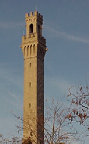 But that meant their original charter was invalid. So there in Provincetown Harbor, they drafted a new one, called the Mayflower Compact. In the meantime, however, Native Americans lurking continuously along the dunes and tree cover worried the group, which had too few people to fight. So they sent men in the small boats called shallops to find a less inhabited place. After six weeks of exploration, they returned with news of Plymouth Harbor over on the mainland. The Mayflower, restored to perfect sailing condition, was moved there for its famous rendezvous with Plymouth Rock and destiny. The Pilgrim Monument was modelled after a similar tower in Sienna, italy. President Teddy Roosevelt laid the cornerstone in 1907 and President Howard Taft dedicated it in 1910. The granite blocks were shipped from Maine. The 252 foot high structure has 116 steps and 60 connecting ramps, so getting to the top takes a little exertion, but the view is spectacular. You can see the town laid out below you, with the harbor off to the North, Race Beach where the Mayflower first washed up to the East, and all of Cape Cod stretching out to the West. On a clear day, with binoculars, you can see the Boston skyline on the horizon. Consider wearing a jacket because the wind really batters you up on that observation deck. When you get back to the base, you can tour the museum, which deals with whaling, fishing, the Mayflower, the Pilgrims, Native Americans, and the beginnings of the tourist industry. Admission is $7 and covers both tower and museum. In June, it closes at 4. From July to Labor Day it's open until 6. If you park down at the waterfront for a whalewatching expedition, you're better off to stay parked there and walk the two blocks to the monument, as it has limited spaces. |