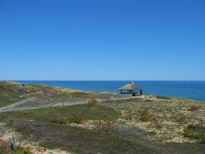 The other stop you must make is Marconi Station. To get there from Provincetown, just drive down Route 6A and turn left. From Paine's Campground it's only a two mile bike ride. From Wellfleet, it's four miles. But it's worth the visit because of the historical significance. This was where Guglielmo Marconi sent the first American wireless message, on January 18, 1903, to the King of England. In effect, this was the birthplace of radio. The bewildering array of transmitters is shown at top left, in a scene scanned in from an old postcard we bought at the Visitor Center. These towers are no longer standing. They fell victim to storms and cliff erosion. The bases can still be seen, some of them up on the plateau, and some of them down on the beach where they tumbled. The photo at left shows the scene today, with only a small observation deck marking the spot. It contains a model of the original array. While you're here, two sidetrips are worth your time. One is the 1.5 mile loop walk into the Atlantic White Cedar Swamp. The other is the descent to Marconi Beach, which stretches for about two miles southward along the base of the cliffs. Many longtime Cape Codders consider it the most beautiful beach on the entire Cape, and it is usually uncrowded. |