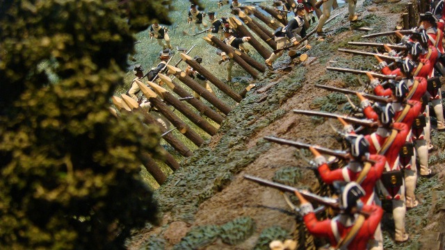 | Cornwallis reached Yorktown first and had time to dig extensive breastworks, build high walls, and fortify them with formidable rows of sharpened logs. (In the 240 years since, the points have been smoothed and rounded by the weather, but when first installed they were dangerously sharp.) As Colonials tried to climb over the sharp points, the British would be firing down on them from above. It would be an almost impenetrable fortress. Behind the walls, Cornwallis had heavy cannon and men skilled in using them. Once this work was done, the British relaxed and waited for Washington's arrival. Many of the men watched the sea longingly, hoping their Navy would arrive soon with supplies of fresh fruit, salted fish, scones and other British favorites which they had been unable to get in the Colonies. | ![]() |