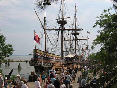 | You cannot hurry a trip to Jamestown Settlement. The waterfront alone is worth an hour. We have boats on lakes and rivers today which are much bigger than the three tiny ships The Virginia Company sailed across the ocean. Stepping on board one of those ships and imagining ocean waves crashing over the decks during storms helps appreciate the men who founded this nation. We have maps, letters, diaries, books and ledgers to verify exactly what the Settlement looked like : what buildings there were, and where they were built relative to each other. You can heft their tools in your hands, try on a shirt of chain mail, step inside their houses, see how they primed and fired their cannon and watch them fixing their meals. Like Williamsburg, this IS a Time Machine. | ![]() |