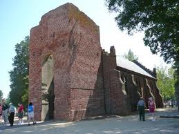 | You really should begin your Williamsburg visit with a day (or at least half a day) at Jamestown, since that's where it all began in 1607. The Virginia Company arrived with its charter from the King of England to establish a colony along the Chesapeake Bay or one of its larger tributaties. They chose the site up the James River because it was sheltered from ocean storms and offered good hunting and large trees needed for building a fort and houses, but had the deep water to allow ships to anchor. It was only gradually they realized it was also mosquito infested, low and damp and ideal for Malaria and Influenza. So they eventually abandoned Jamestown and moved the Virginia Headquarters to higher ground at Williamsburg. Shown above left is the Susan Constant, the largest of the three ships which brought the Virginia Company to Jamestown. Above right is the church they built, and at right is a painting of the colony. Since Jamestown was abandoned as a fully functioning colony, it has been a treasure for archaeologists and historians. | ![]() |