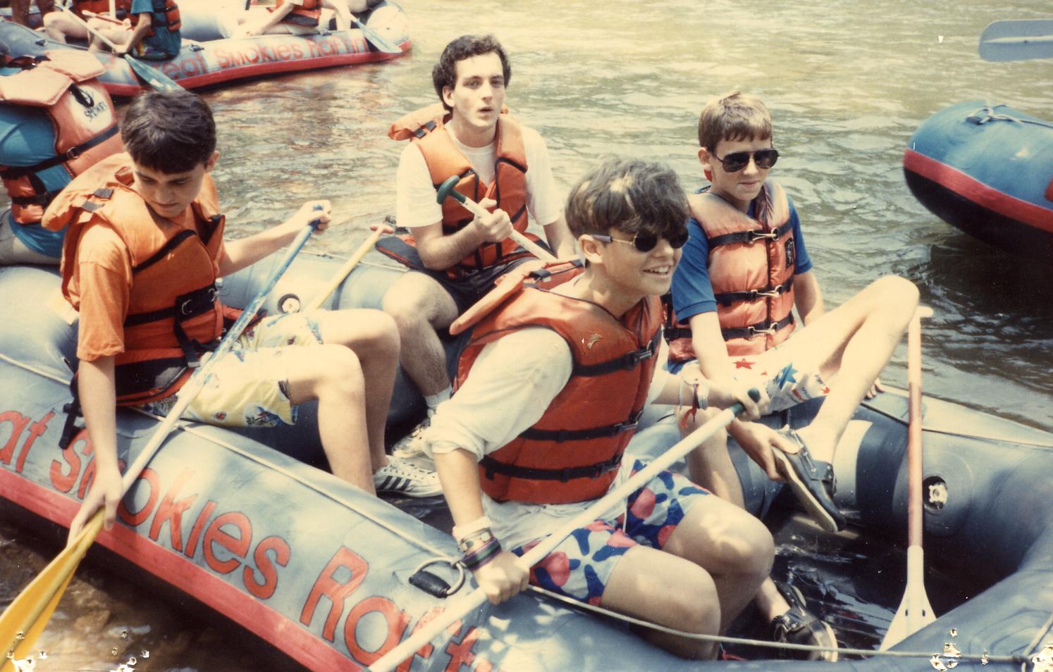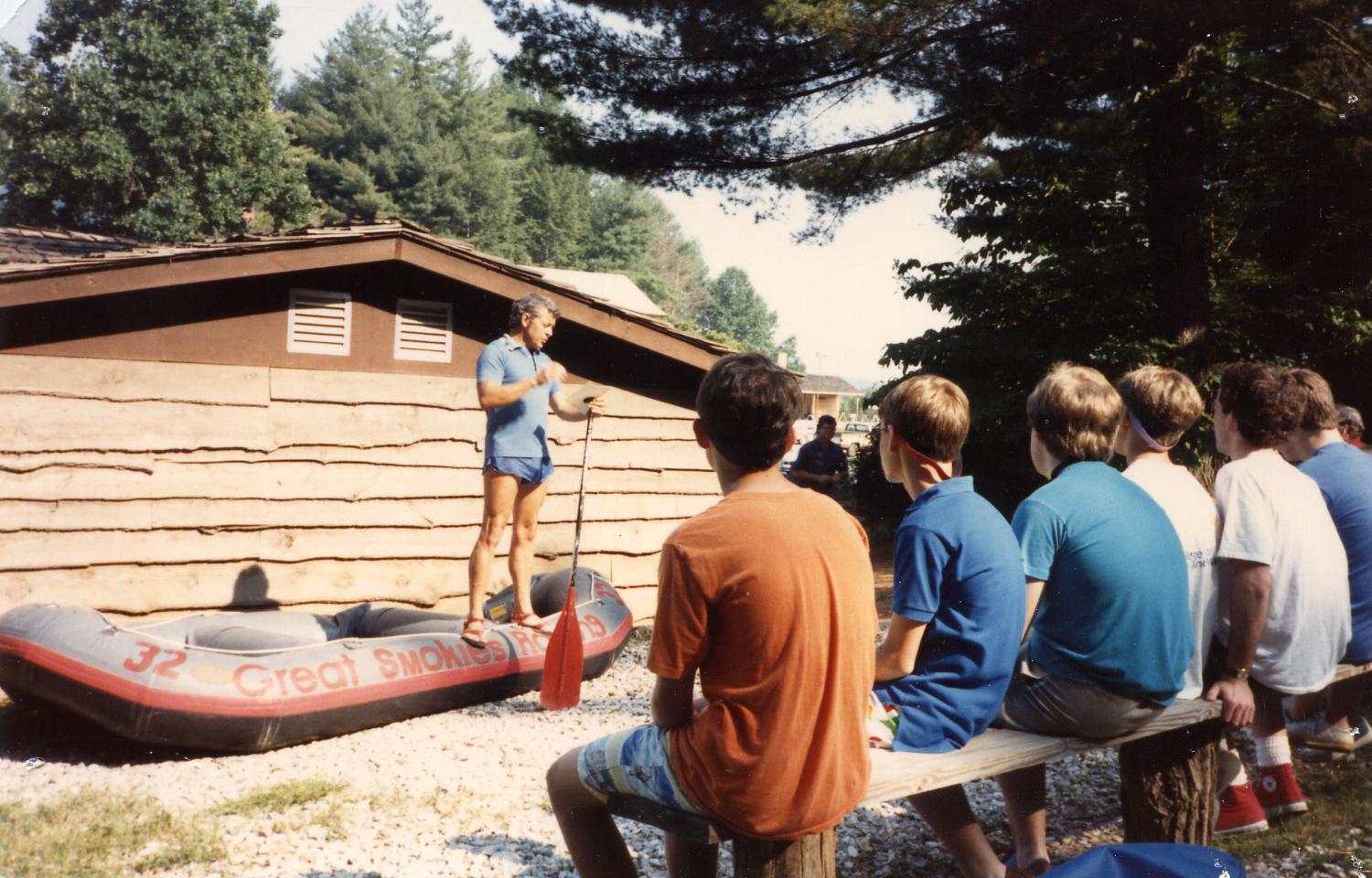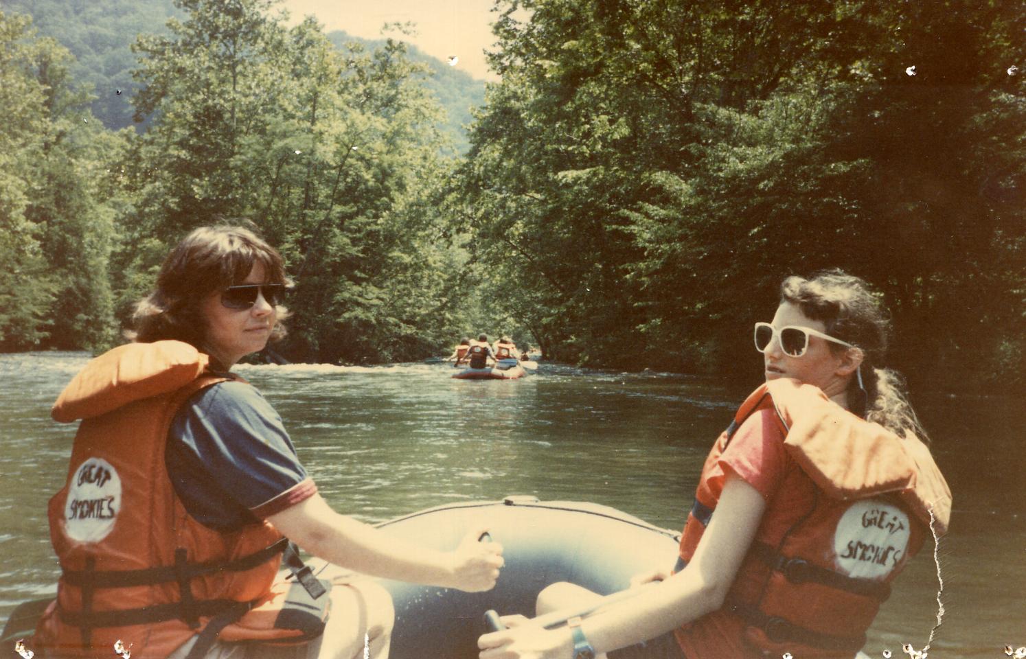Everyone needs sandles or "river shoes," sunglasses, bottled water or other beverage, sun tan lotion, and clothes they can get get wet. Cameras need to be in plastic baggies zipped shut. Notice in these photos the rafters are not wearing helmets. On the bigger rivers, they'll be required to. However, life vests are mandatory. We take a "dry bag," which we bought here at the NOC 30 years ago, to hold cameras, cell phones and valuables. We can clip it to one of the raft's ropes or metal rings. Be careful of watches; wear only waterproof, not just water resistant models.