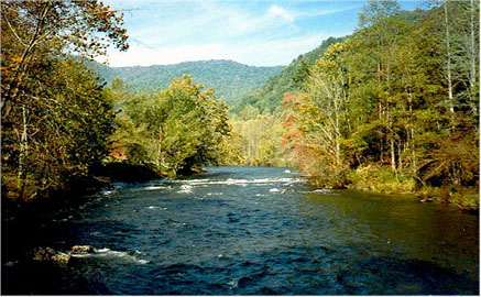 The Nantahala River on the North Carolina side of Smoky Mountain National Park is the best first rafting river out there. It's a forgiving enough river that new rafters can make their mistakes, but there are enough tricky stretches to develop their skills. Then it winds up with an adrenaline drop over Nantahala Falls which requires stopping, discussing with a guide how to approach, line across just above the drop, then shoot it at the proper angle. This is a dam controlled river so it flows well all year. A Nantahala trip is also a shakedown cruise for new rafters, who need to learn to get a good night's sleep, eat a good breakfast, get wet, stay wet, and learn about the whole whitewater rafting culture. This is a Class II river until the Class III final drop. A good paddler could bring a covered canoe filled with flotation bags, or a kayak, down with no problem. But it would be over the skill level of the average teenager, so we consider it a rafting river. |